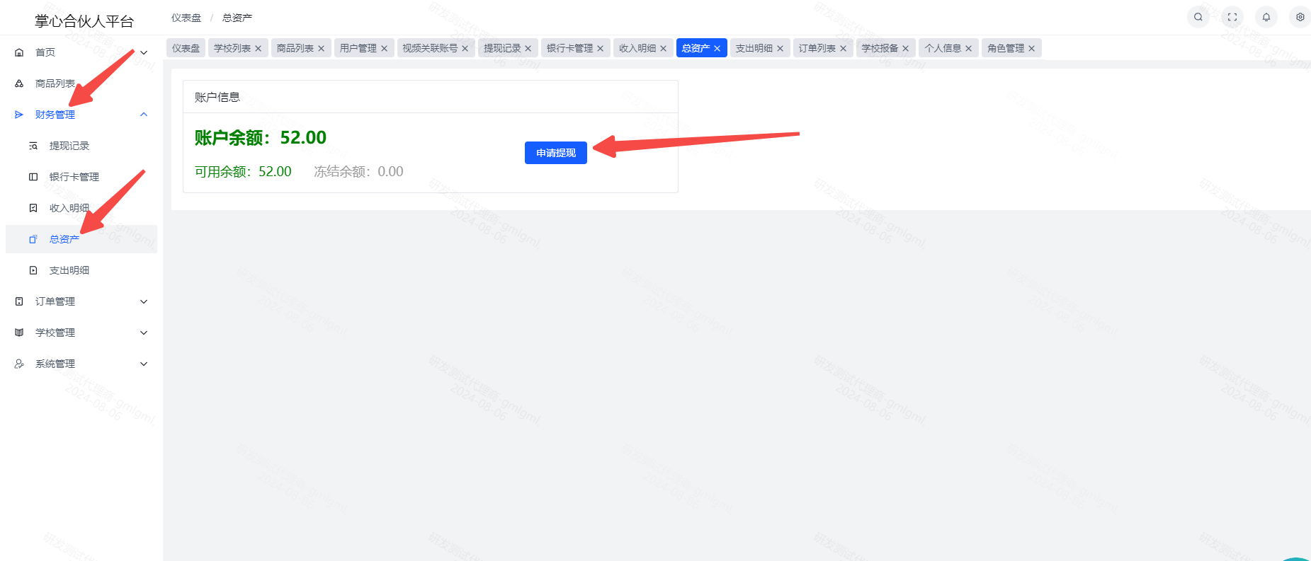 2、点击财务管理-总资产即可查看所有的可提现余额,点击申请提现