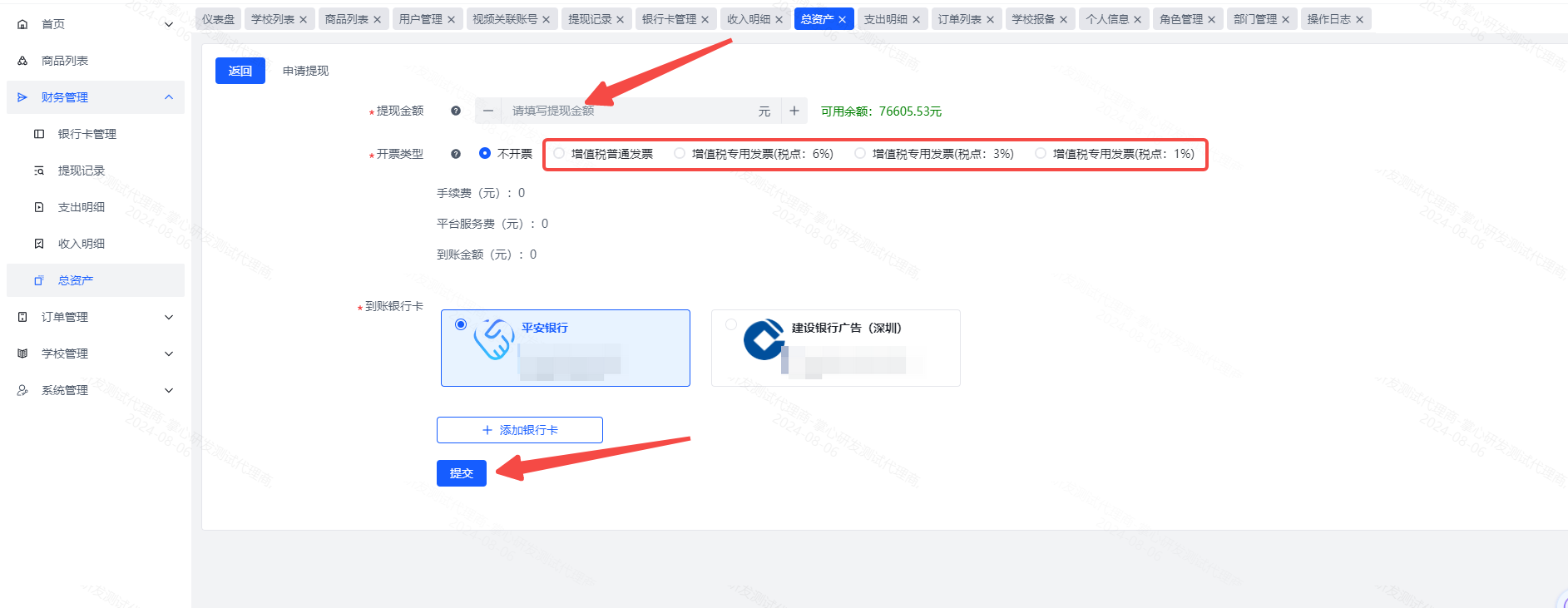 3、对公提现金额必须大于 500 元、对公提现需开发票,可选择开票税点、选择对公银行卡(或添加银行卡),点击提交。(注:对公银行账户信息须与代理商签约主体保持一致)