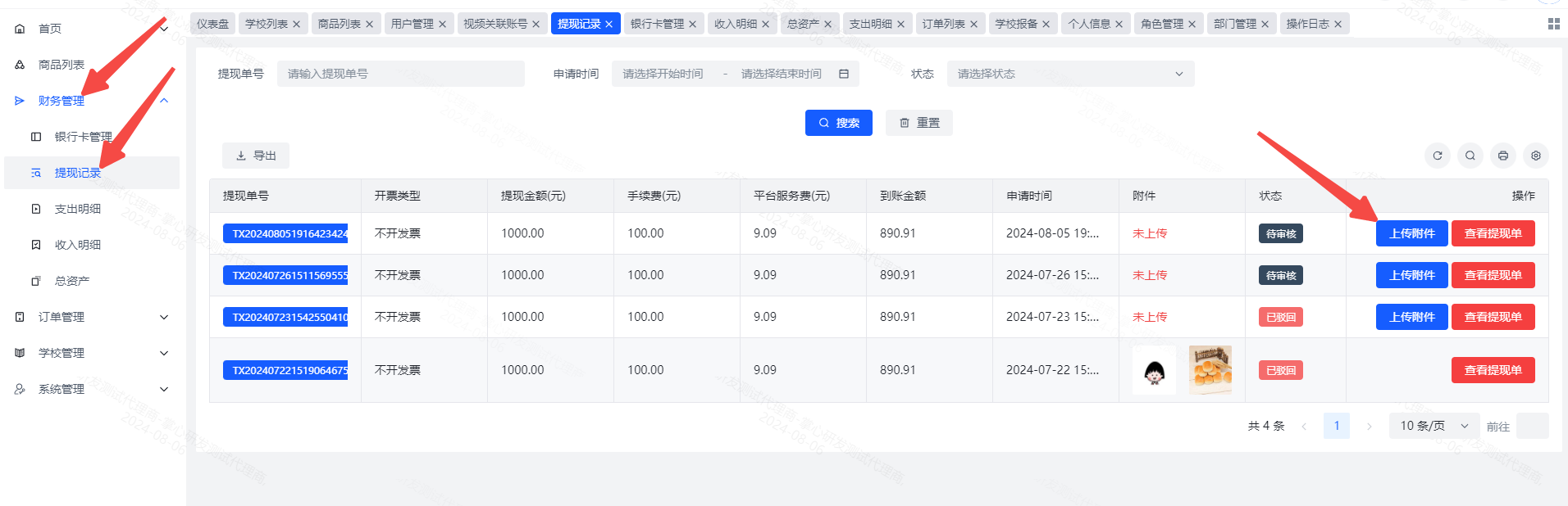 4、提交之后点击财务管理-提现记录-点击该条提现后面的查看提现单,然后需要打印出来并加盖公章(提现单公章名字需和提现公司名字一致),再拍照或者扫描生成 pdf 文件上传系统。