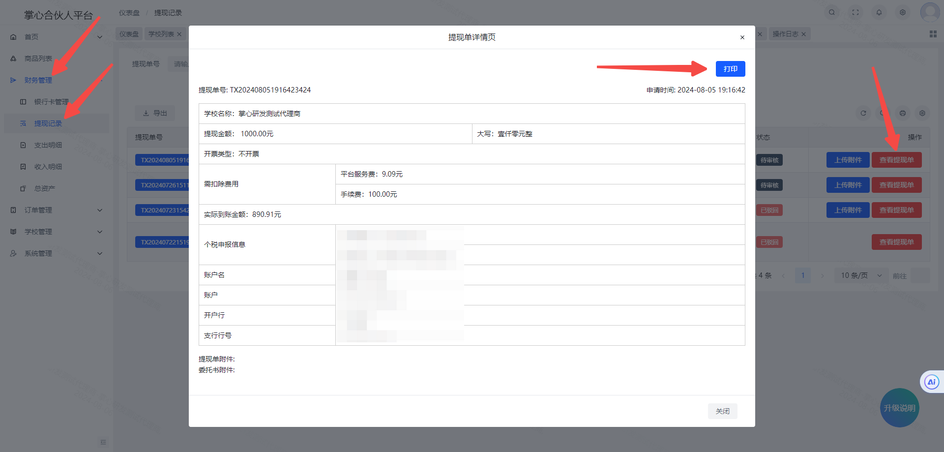 4、提交之后点击财务管理-提现记录-点击该条提现后面的查看提现单,然后需要打印出来并盖章,之后拍照或者扫描生成 pdf 文件保存。
