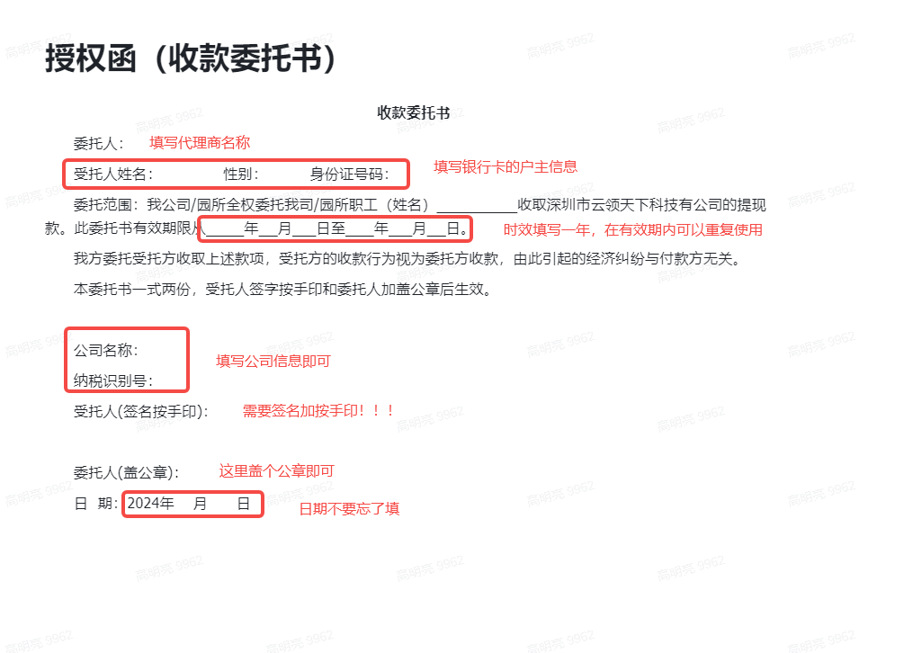 5、委托书填写模板(如下图所示):授权函(收款委托书)