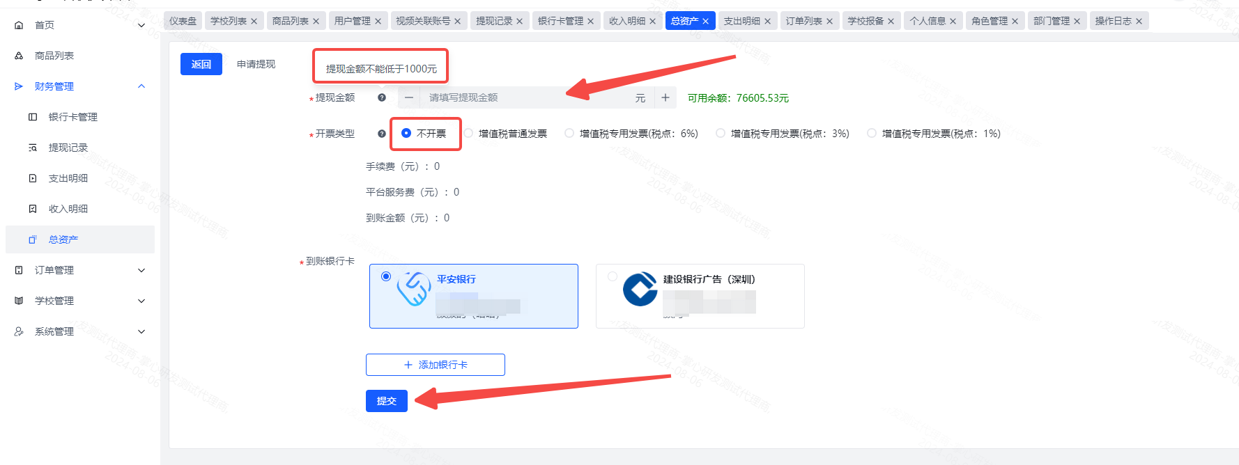 3、对私提现金额必须大于 1000 元、公对私提现需出具委托书,首选申请提现,填写金额,选择不开发票,选择银行卡,提交即可