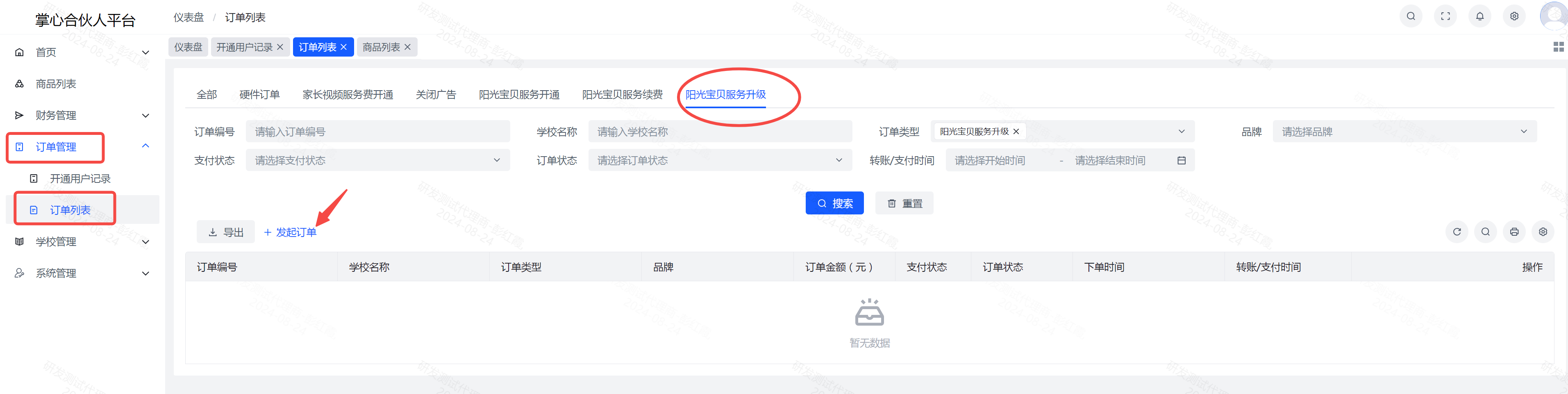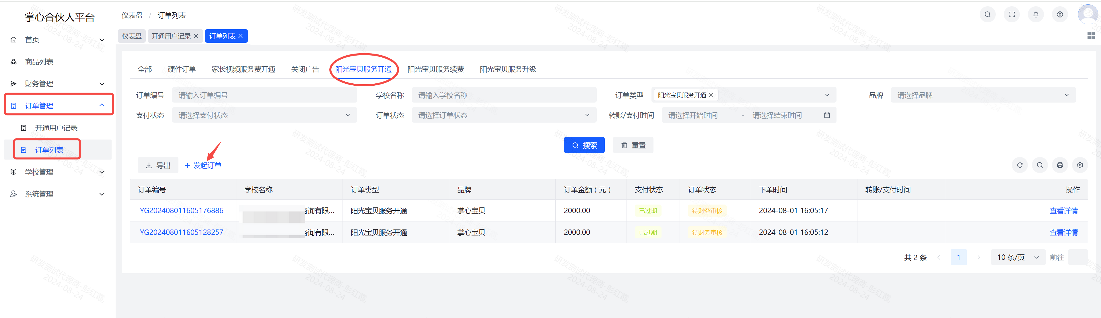 2、下单操作:订单管理——订单列表——阳光宝贝服务开通,发起订单,填写相关内容(具体如下图所示);