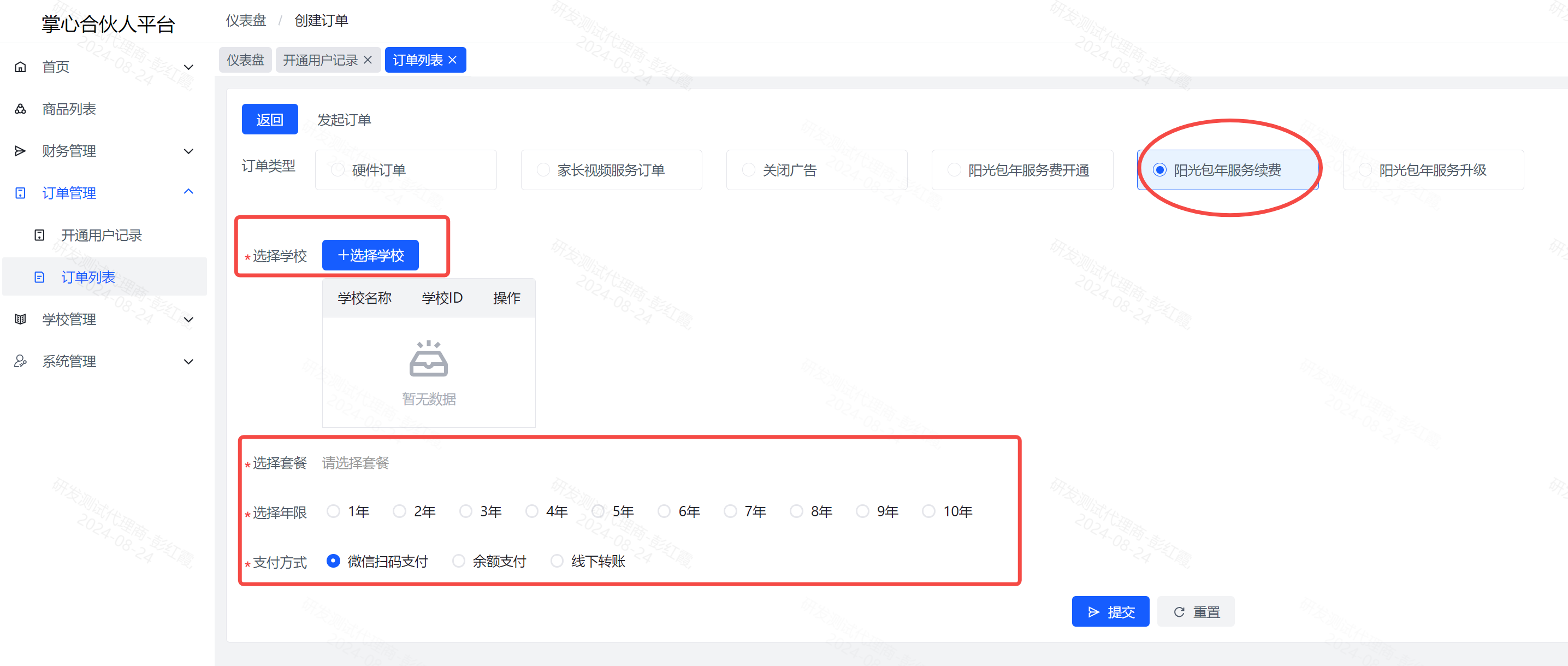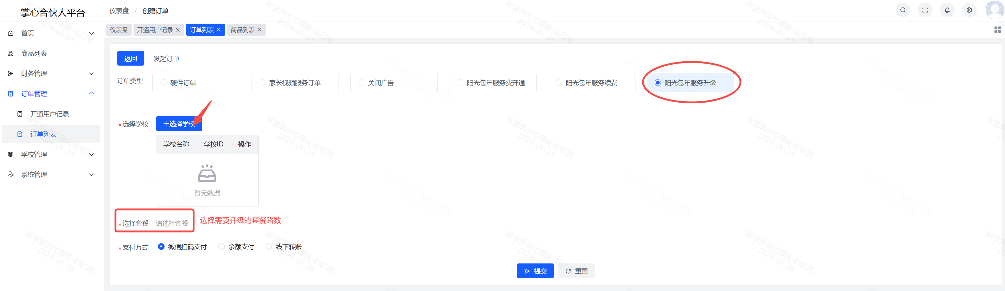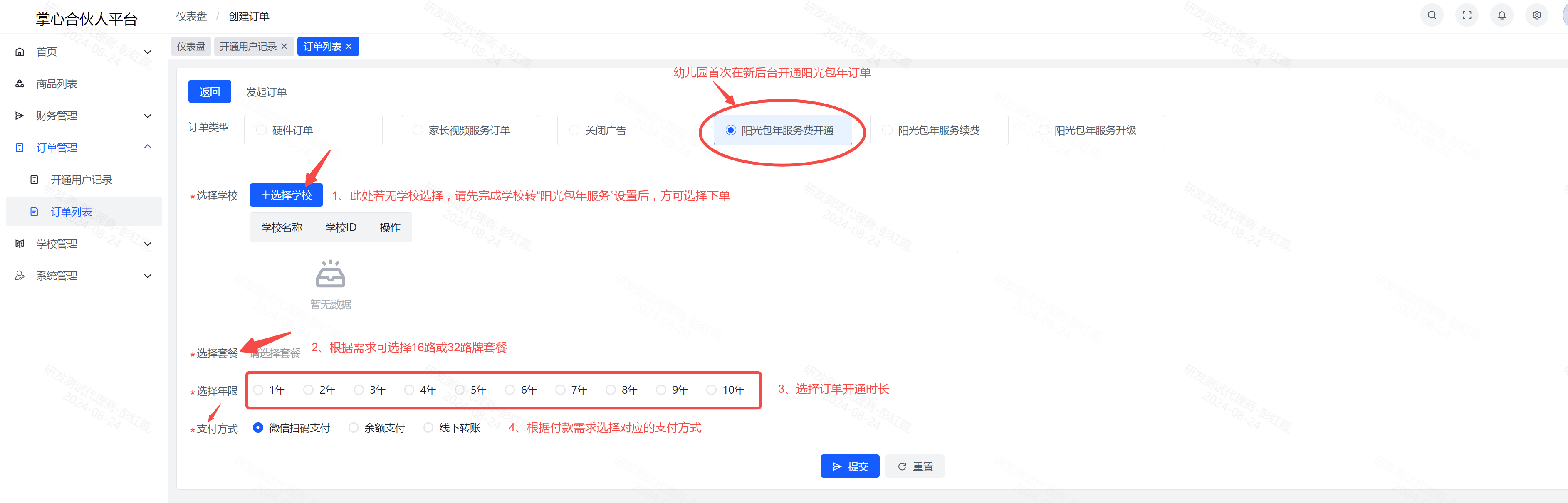根据合伙人的业务需求及相关申请,总部在完成申请幼儿园转“阳光包年服务”的设置后,需要合伙人在合伙人后台通过订单支付方式开通“阳光宝贝服务”(即开通监控)。