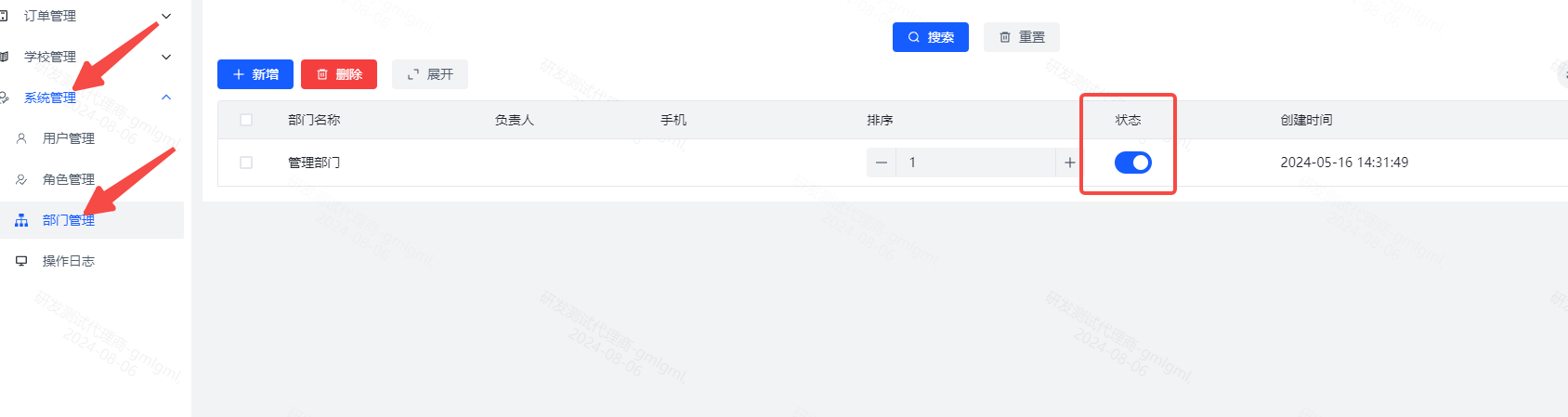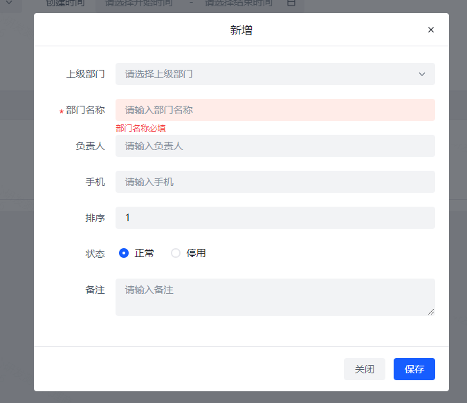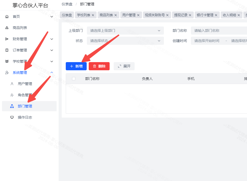 2、首先新增部门,点击系统管理-部门管理-新增 ,可以设置部门名称以及负责人和手机号,带星号必填,不带型号可以不填