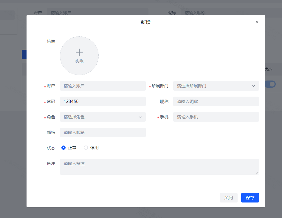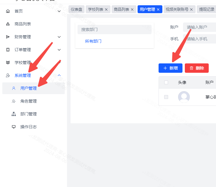 4、最后就是添加用户也就是子账号,点击系统管理-用户管理-新增,输入账户以及密码(使用这个账号密码即可登录后台),选择部门和角色,填写手机号,点击保存即可完成添加