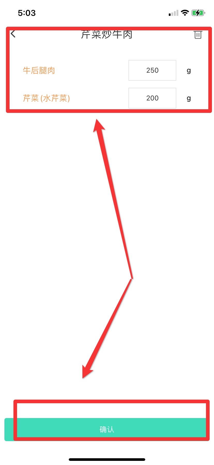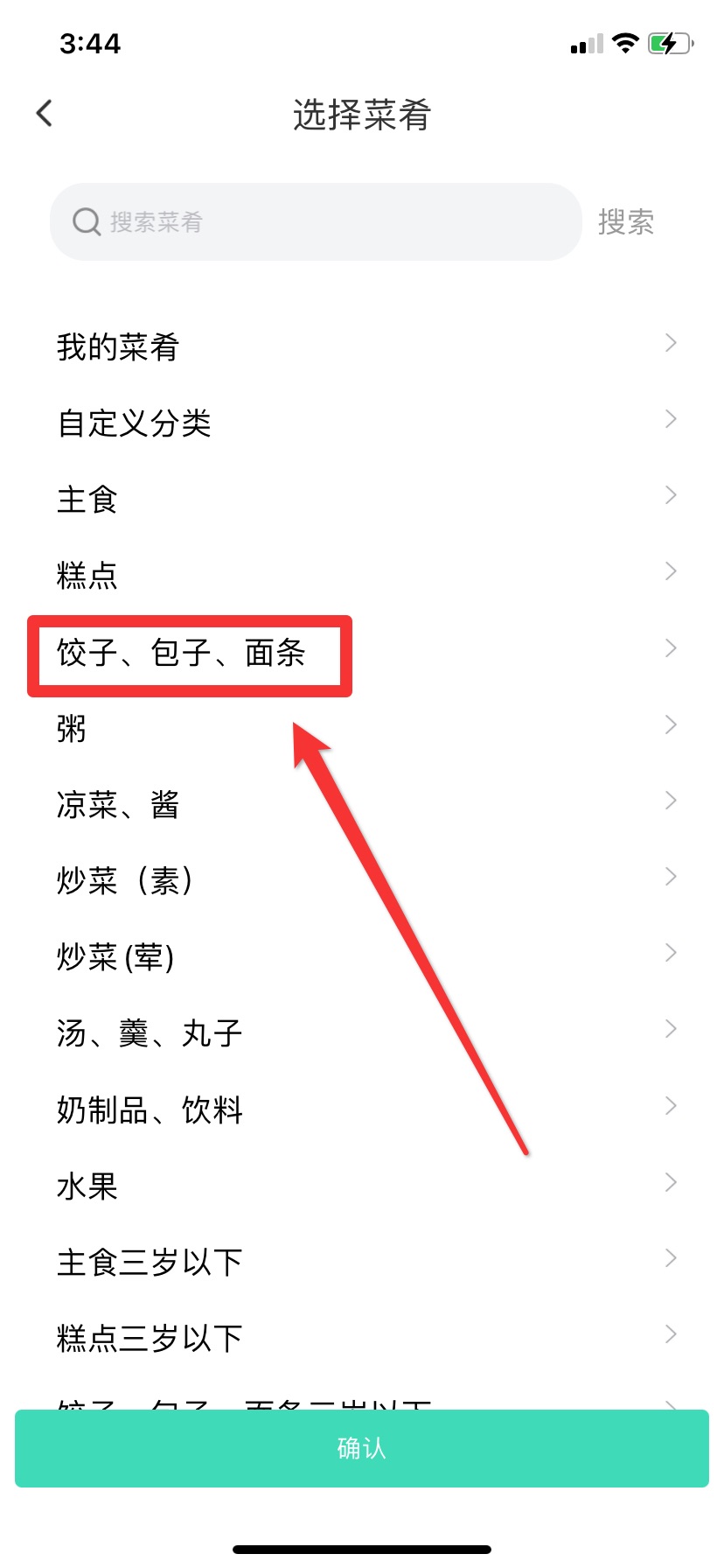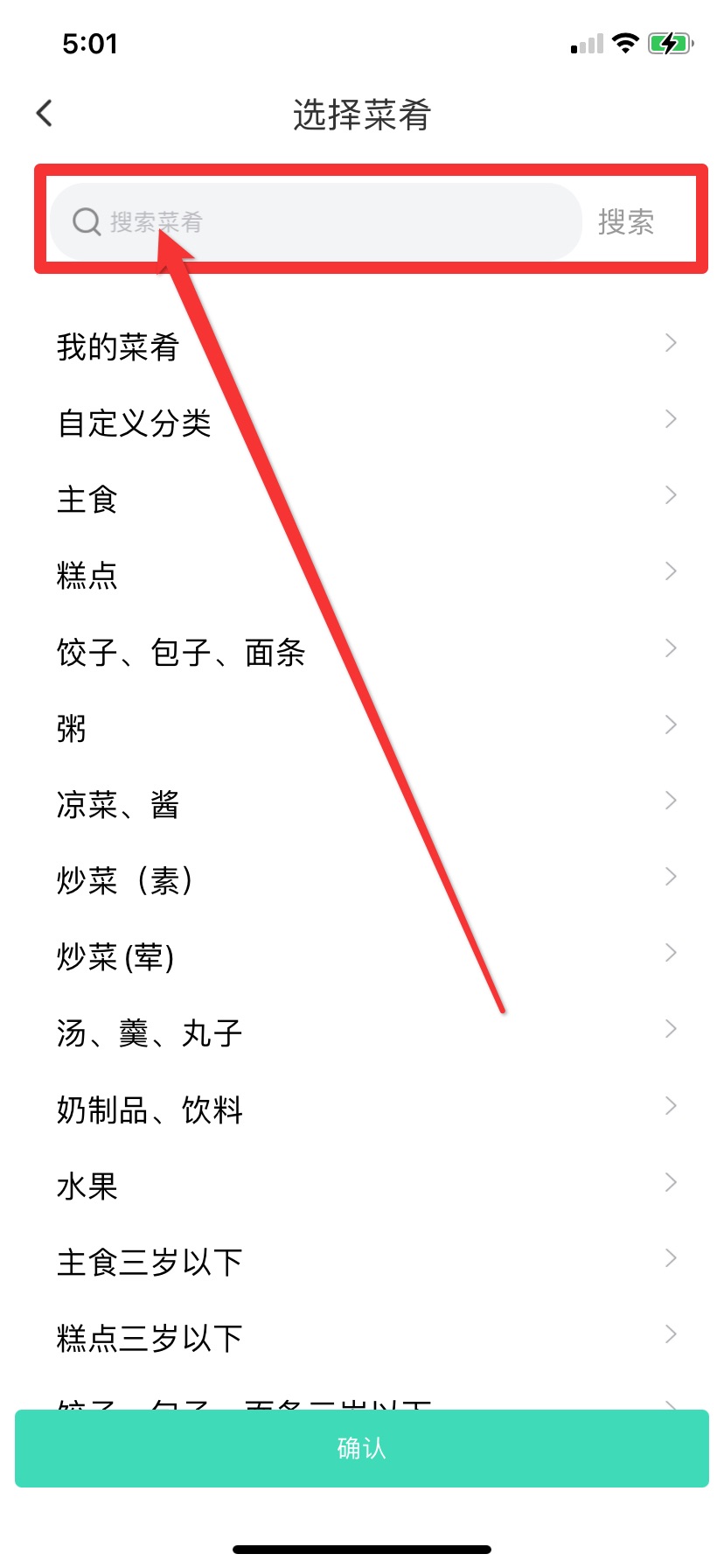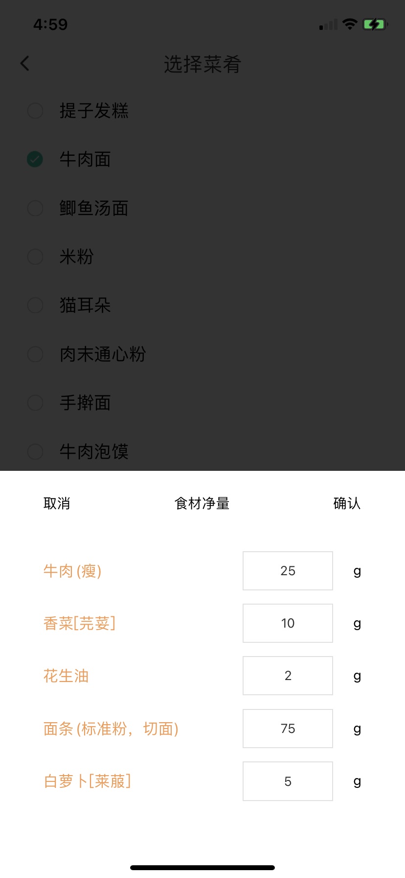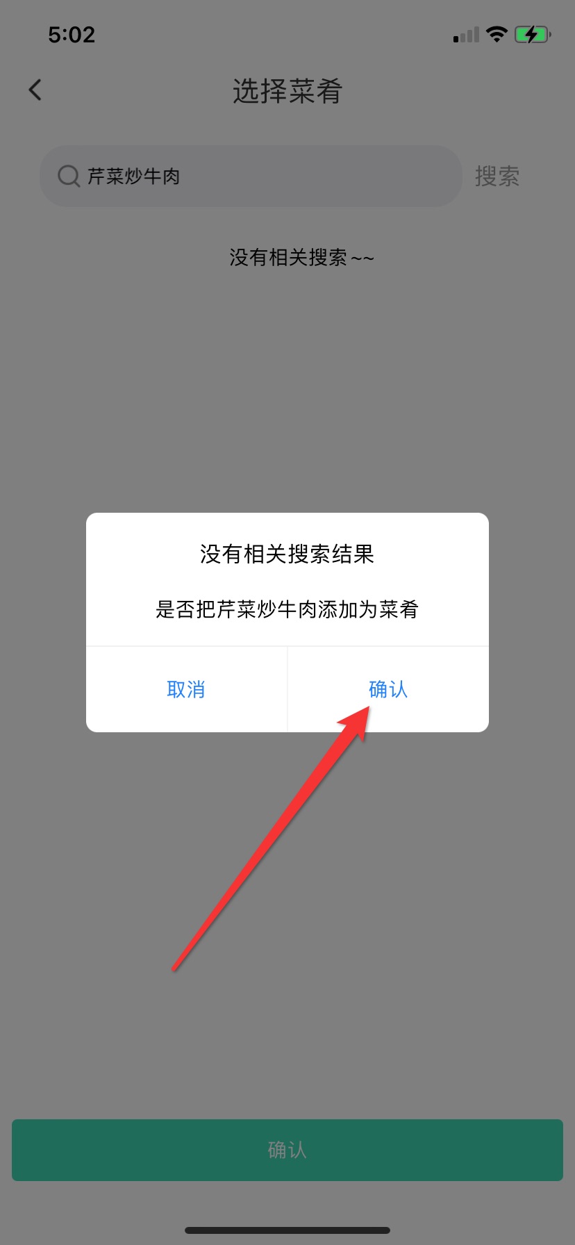 4.还可以自定义菜肴,在食谱库中搜索菜肴名称-确认添加-选择所需食材用量,最后确认完成添加。