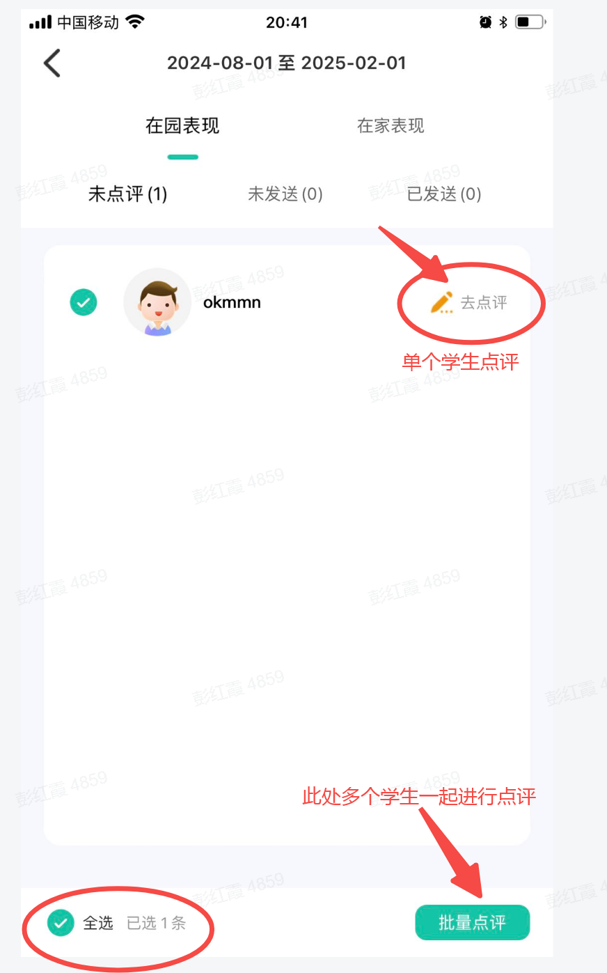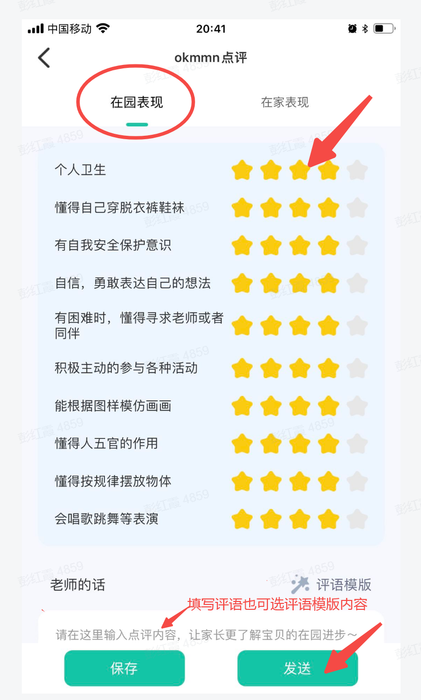 老师进入班级的家园联系册后,可以根据固定评估周期(每周/每月)或非固定评估周期来进行点评。若是固定评估周期,则系统会按照固定评估周期生成;若不是,则需要老师先创建评估周期,然后才能对学生进行点评。老师点评学生时,既可以批量点评,也可以单个学生逐个点评。在老师点评完成后,需要将点评信息发送给家长,家长才能看到老师对学生的点评。