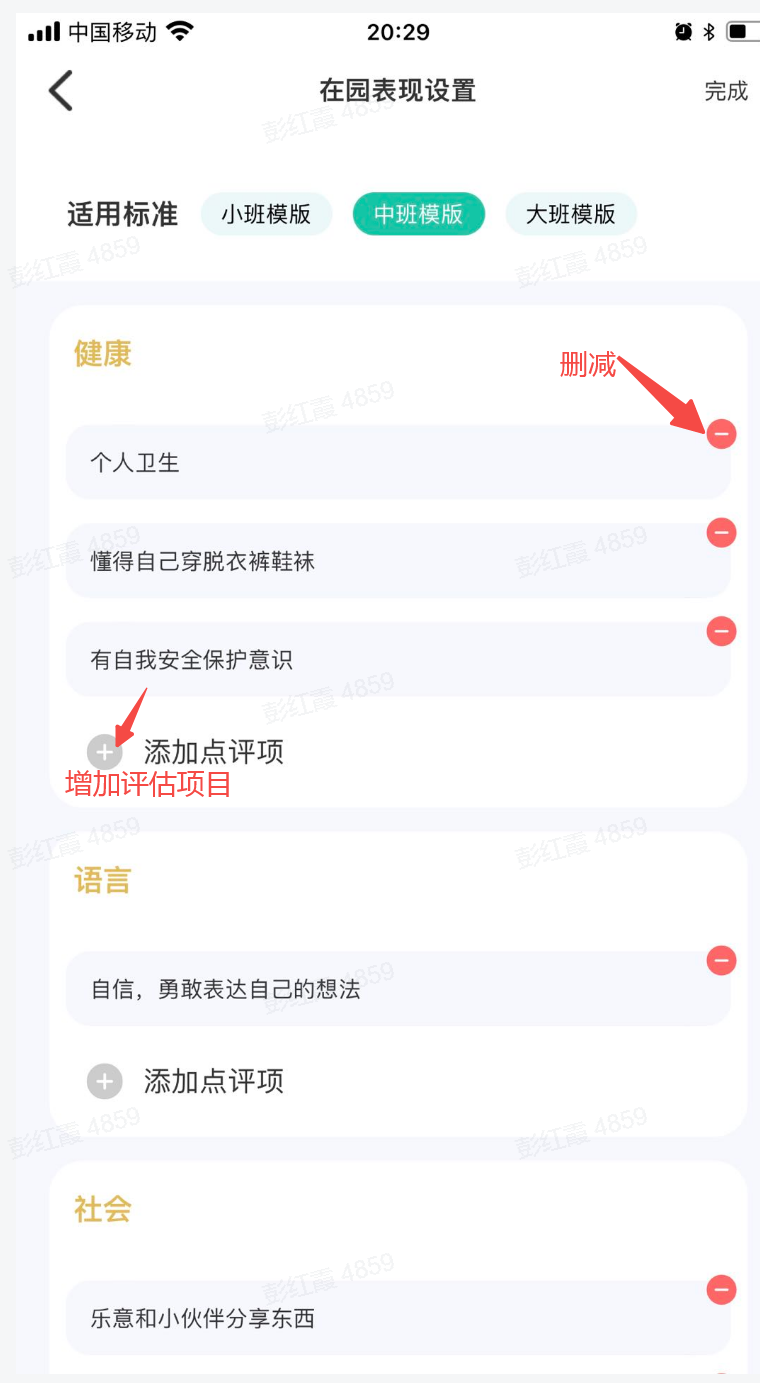 操作方法:登录园丁端 APP——工作台——家园联系册——选择学期,点击右上角“设置”——选择班级设置评估项目——评估细项增减——右上角“完成”即可。
