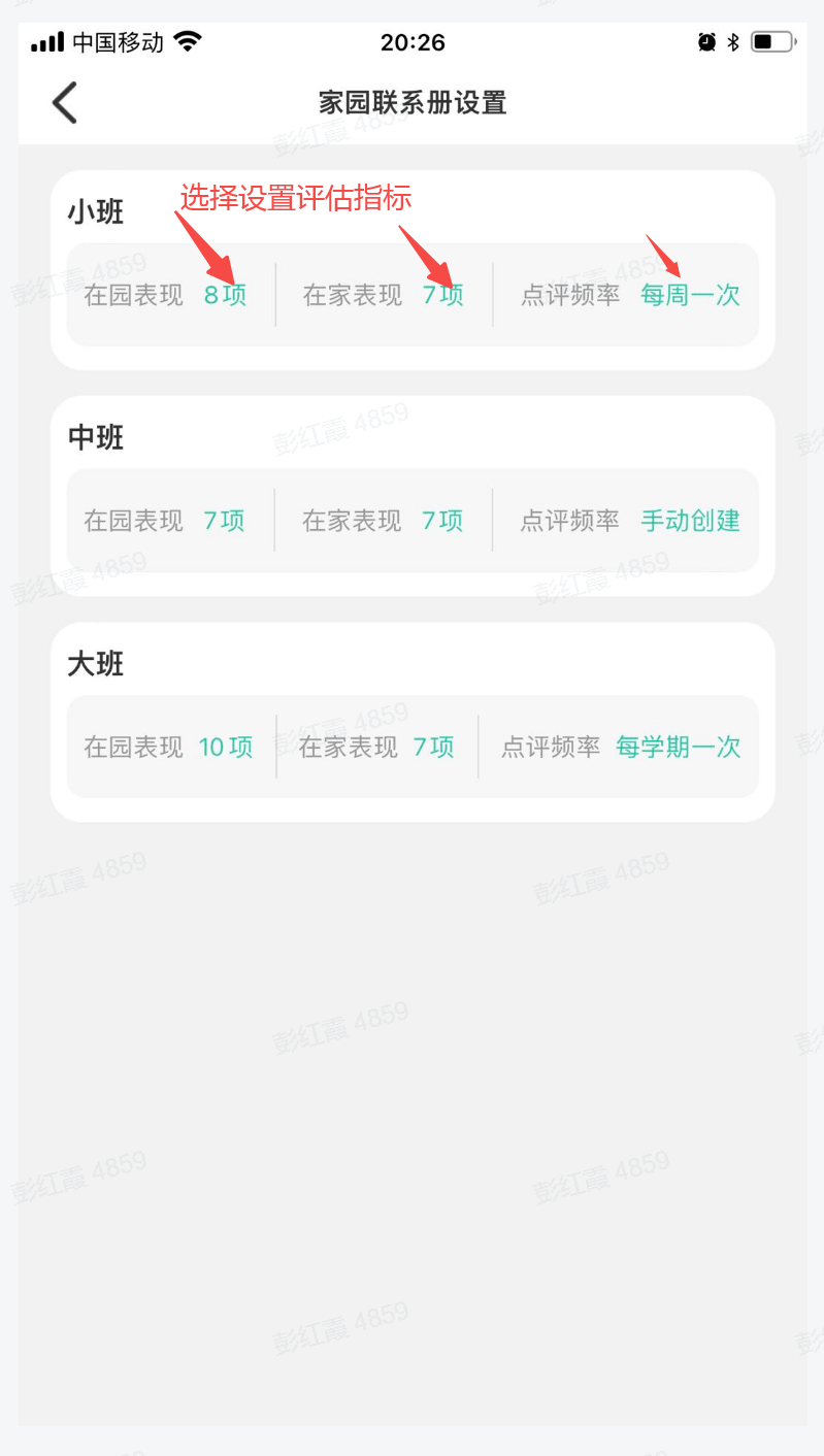 园长或已授权的老师可在家园联系册中设定各周期的评估指标,还可根据年级设定评估周期和评估指标。