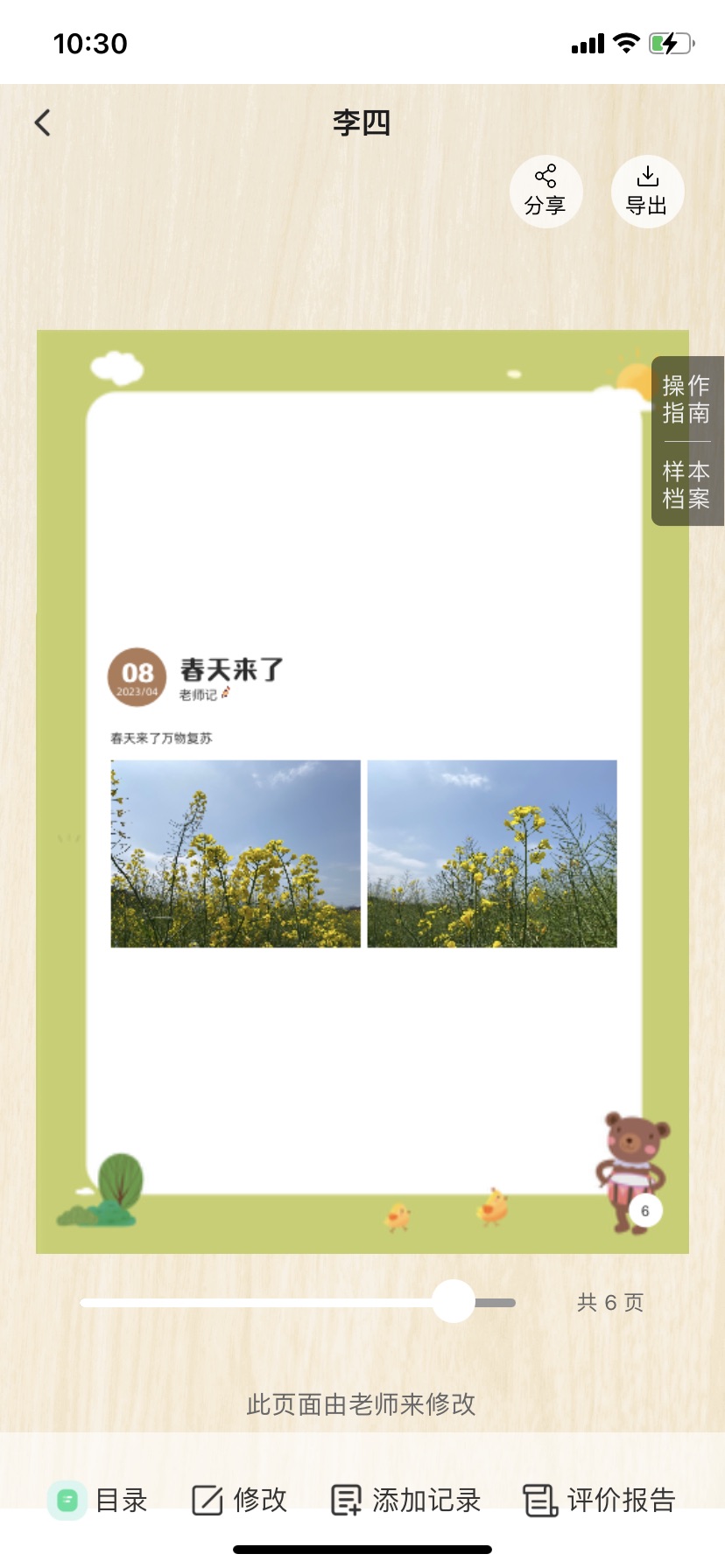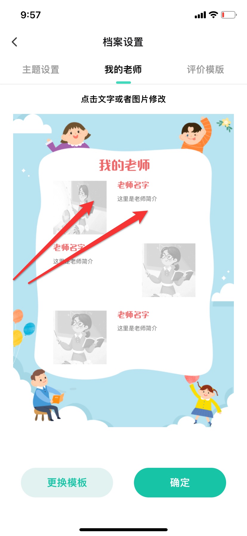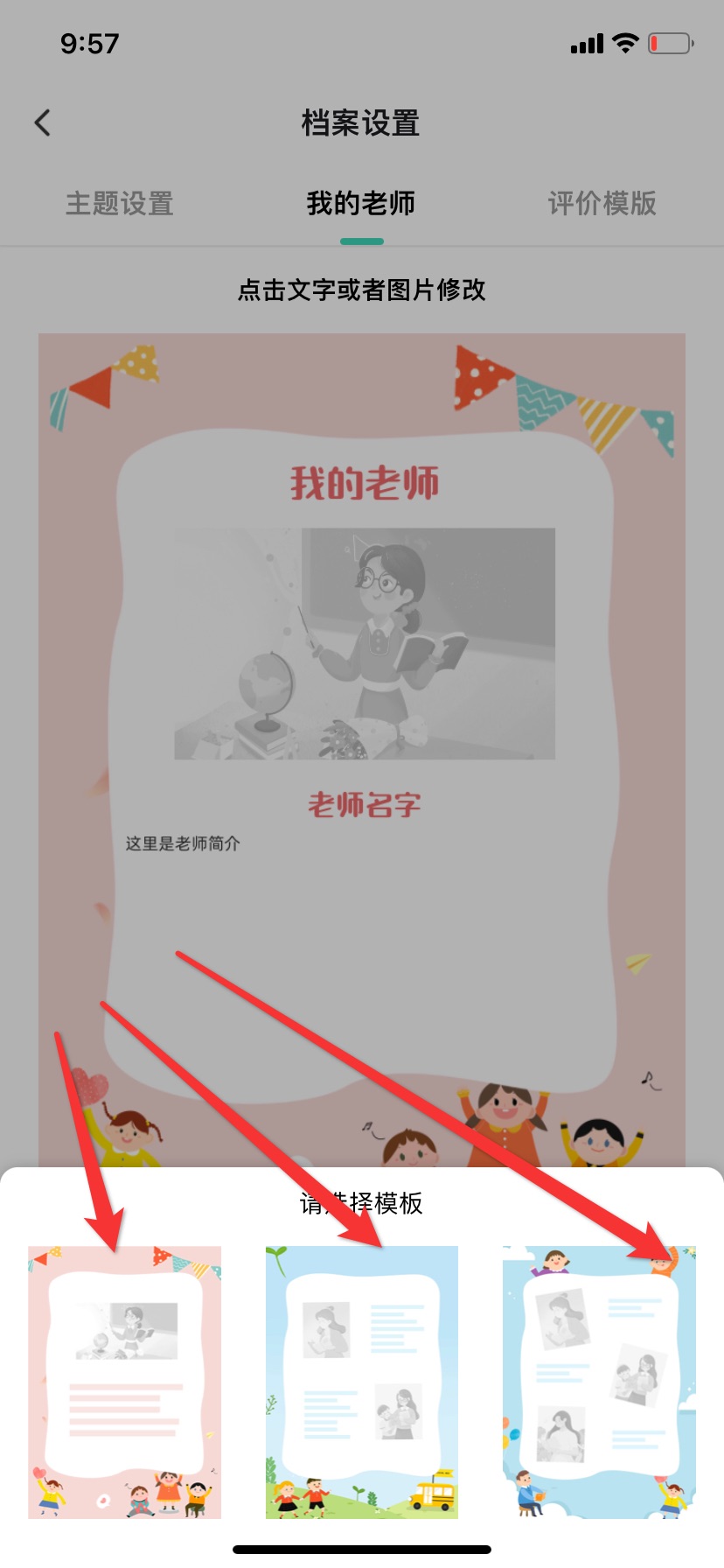 - 我的老师:学生成长档案册内可设置“我的老师”页面,我的老师页面提供了三种的模板,根据班级老师的配置选择合适的模版,上传老师的介绍照片,同时可编辑一段寄语内容。