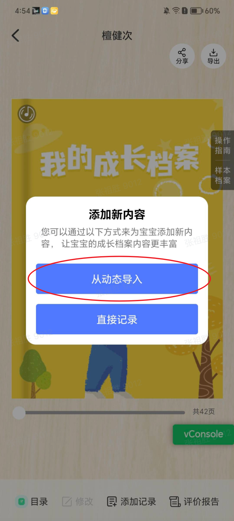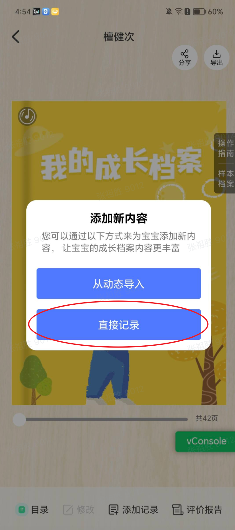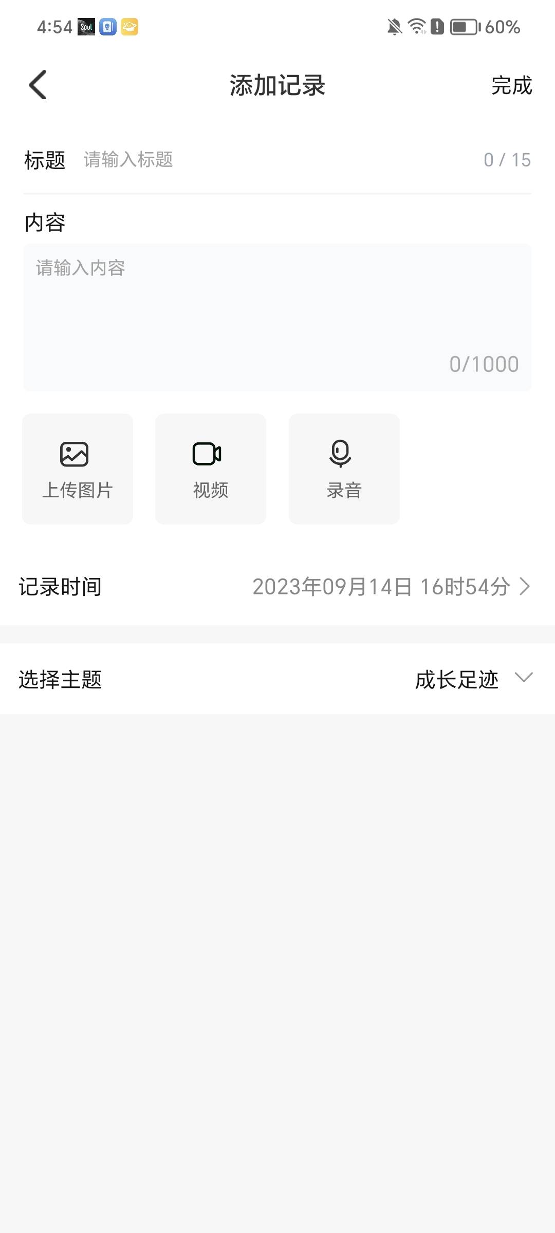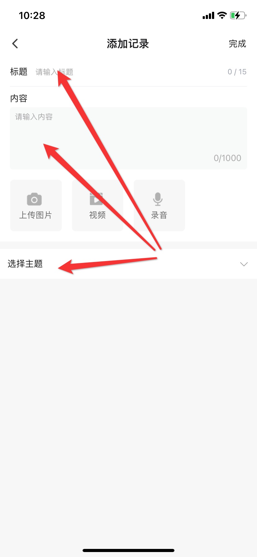 - 直接记录:需要手动输入文字标题、内容、导入手机里面的照片,不推荐使用,可做结束环节的档案内容补充来用。