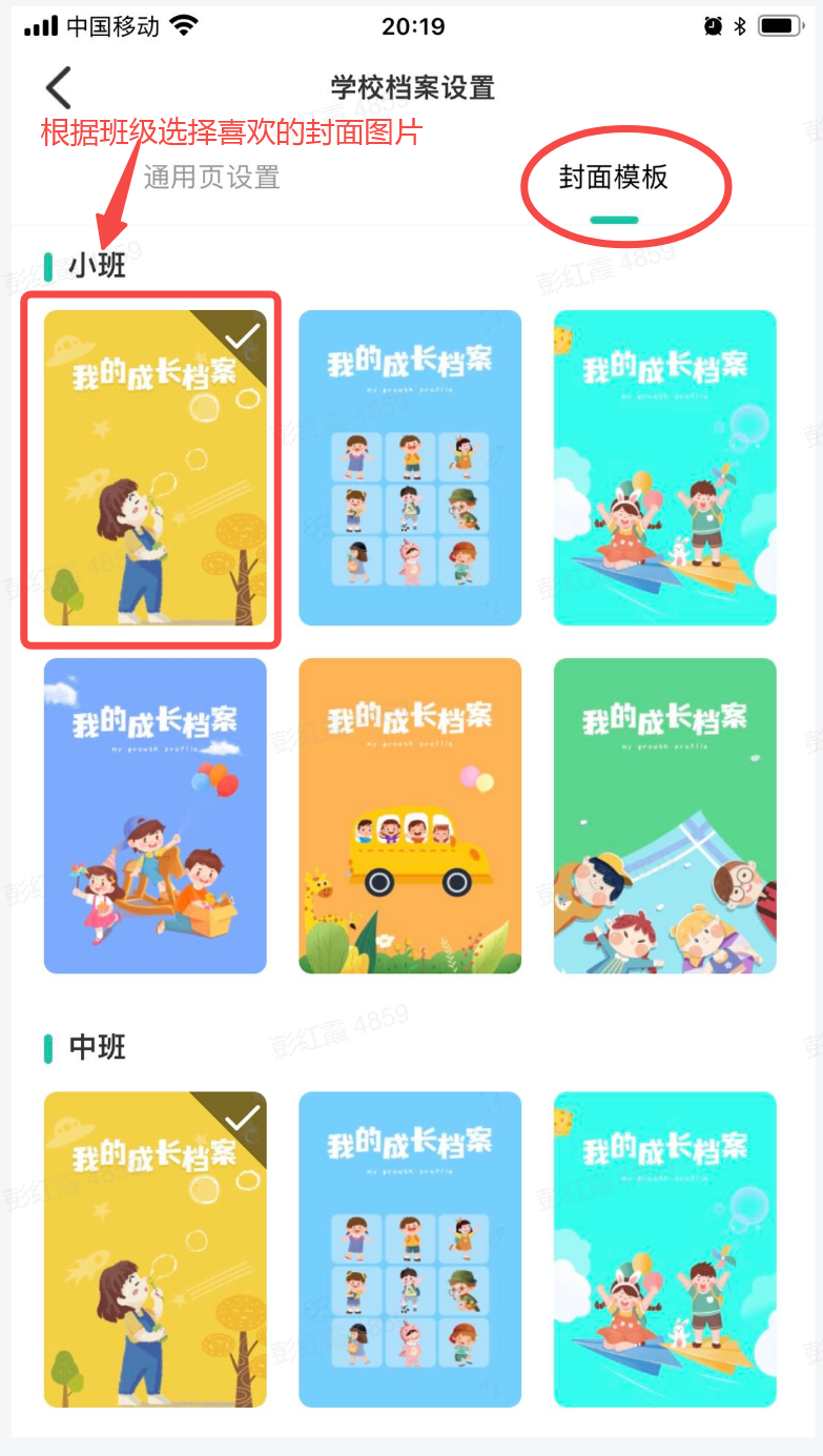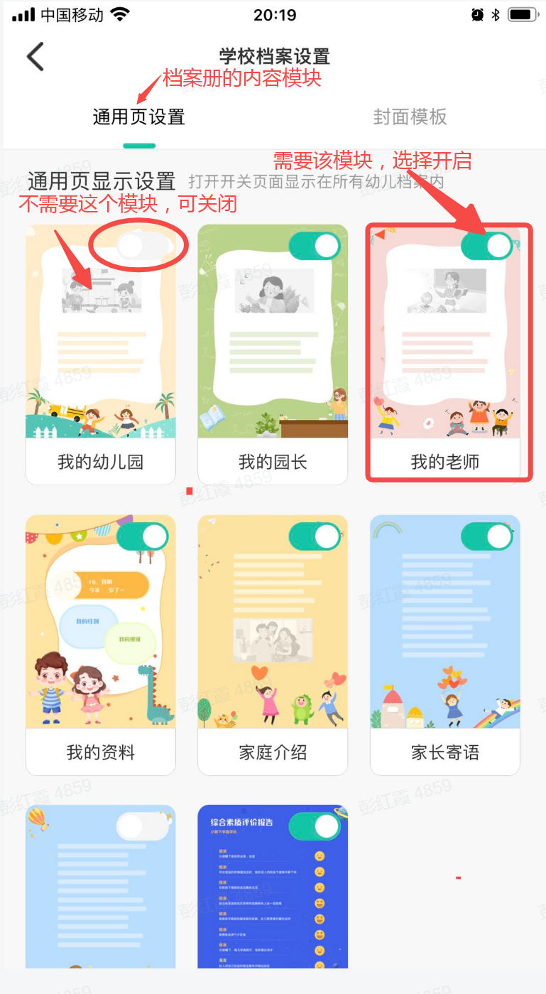 用园长账号登录,可在“学校档案设置”中,完成档案册“通用页设置”(系统内置了 8 个学校成长档案通用的内容模块)的内容设定以及封面模版的选择,绿色图标显示页面已打开,还可根据幼儿年龄段选择不同封面。