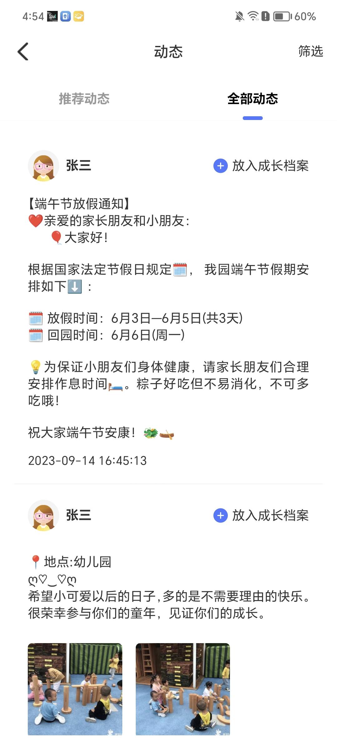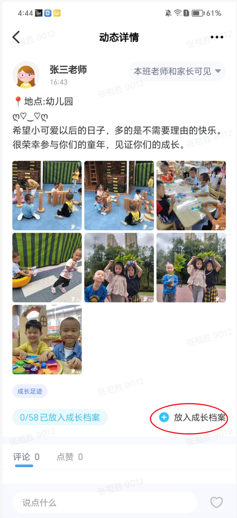 方式二:在班级动态的详情页,选择把动态照片放入到对应的学生中,对于是多个学生的照片,也可一次性放入到多个学生的成长档案中。