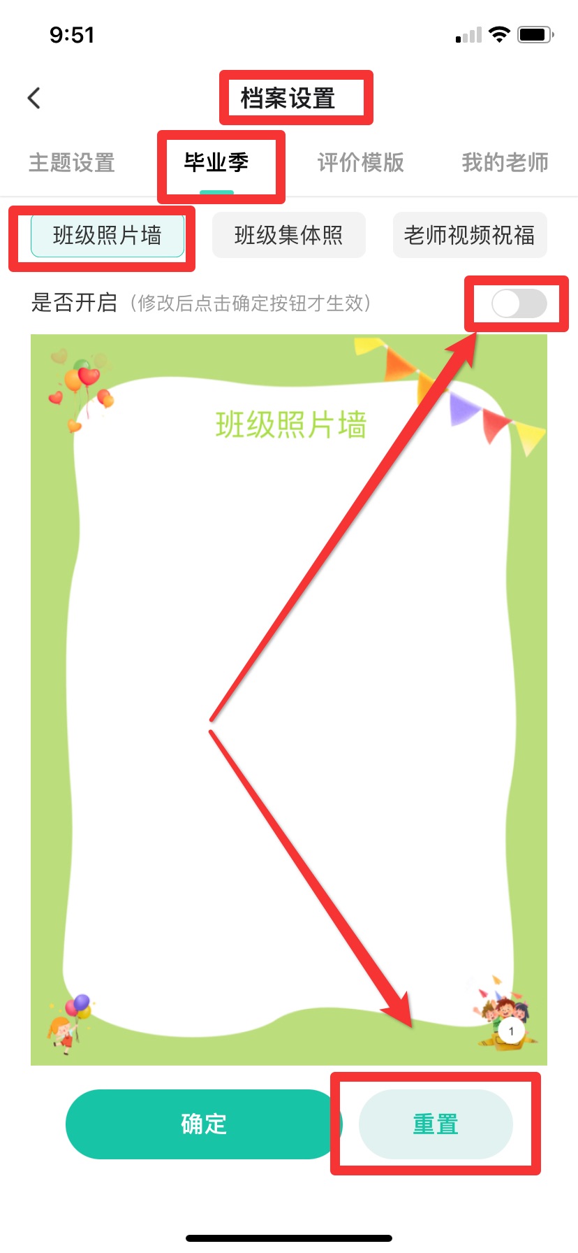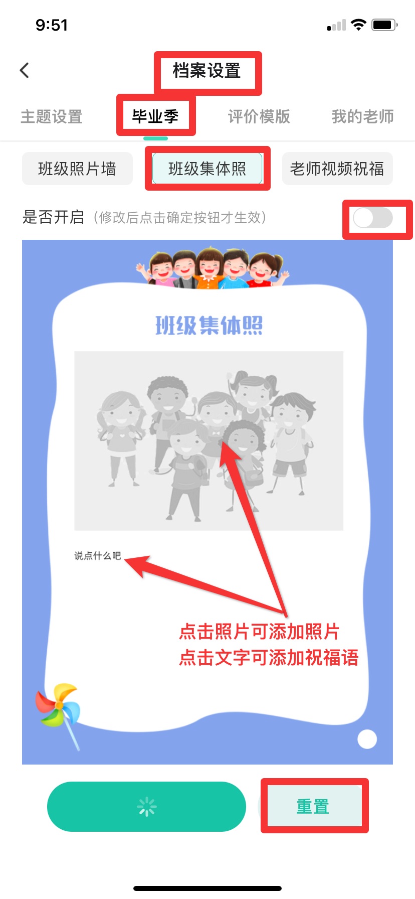 - 毕业季:如所在班级是毕业班,可开启毕业季内容,绿色按钮显示已打开,灰色显示已关闭;