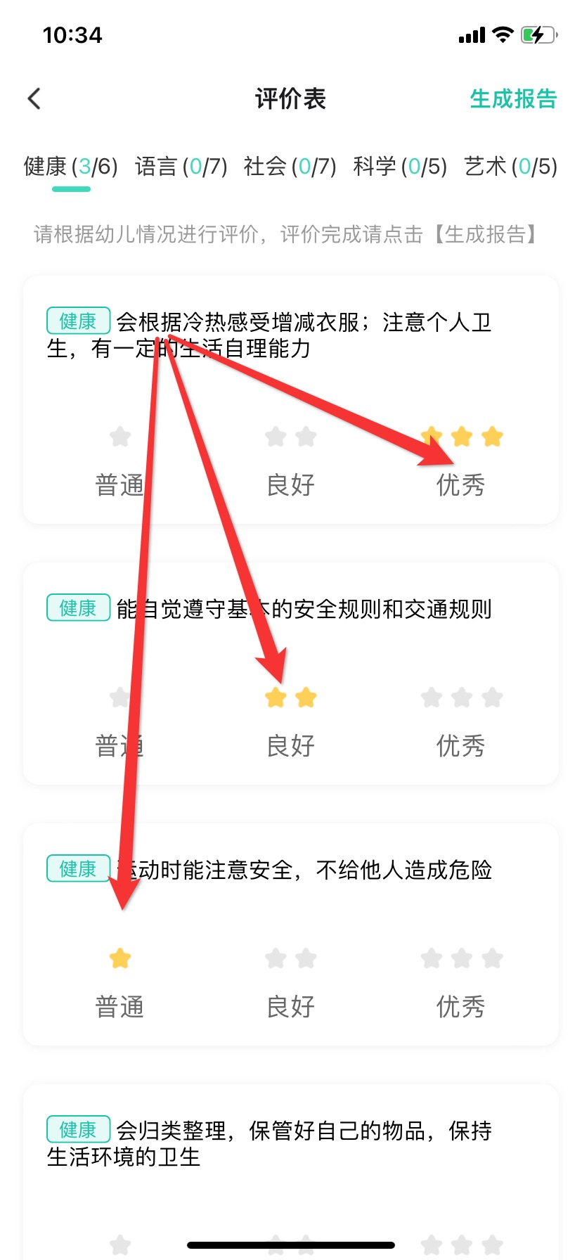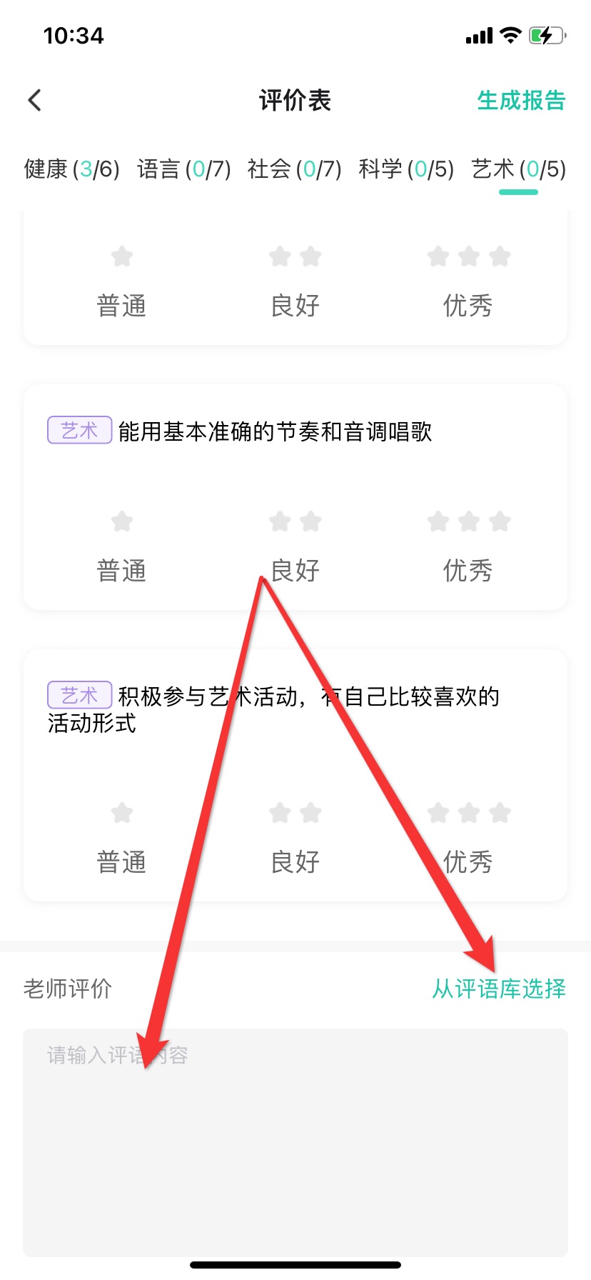 - 参考幼儿 3-6 岁发展指南和五大领域的内容进行评定打分,在评价报告最末尾有“老师评价”板块内容,可从评语库中选择符合该幼儿性格的评语,也可自主编辑评语内容。具体如下图所示: