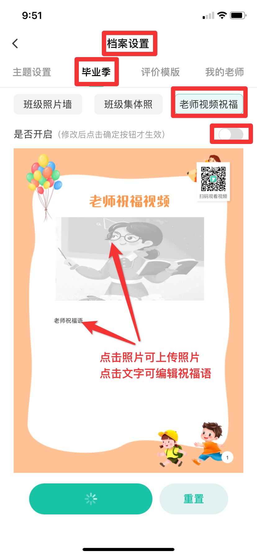 老师祝福视频:需要老师上传一个视频,同时可编辑一段寄语内容;