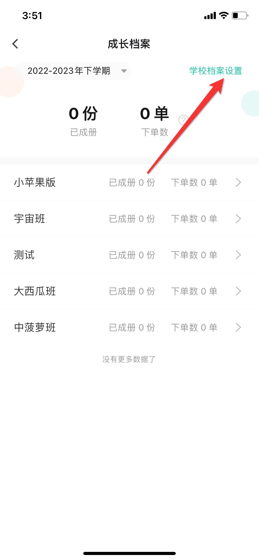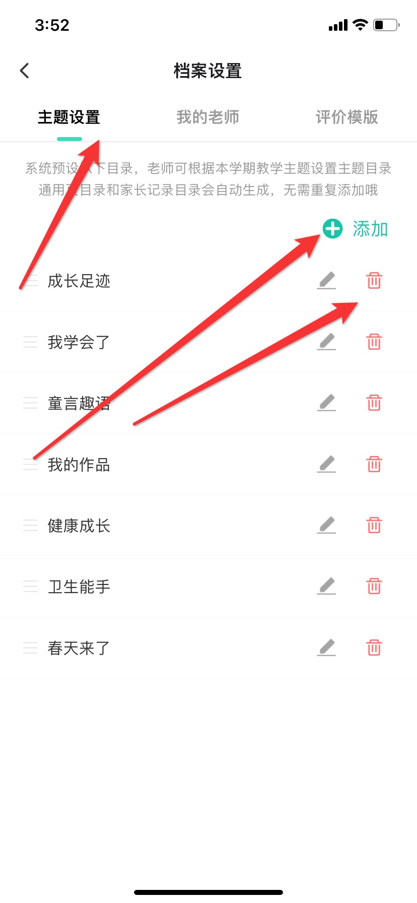用老师账号登录园丁端 APP,在工作台点击“成长档案/档案设置”,可设置的内容为:主题设置、毕业季、评价模板、我的老师;系统预设 6 个默认主题,老师也可再自定义主题。