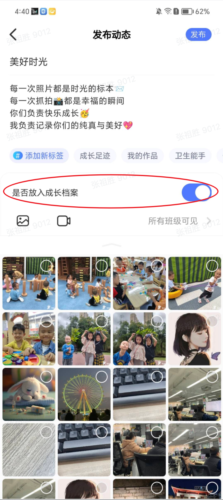 方式一:在发布动态的时候,可选择把当前动态直接方式成长档案中(人脸聚类会自动把学生的照片放入到对应的学生成长档案中)。