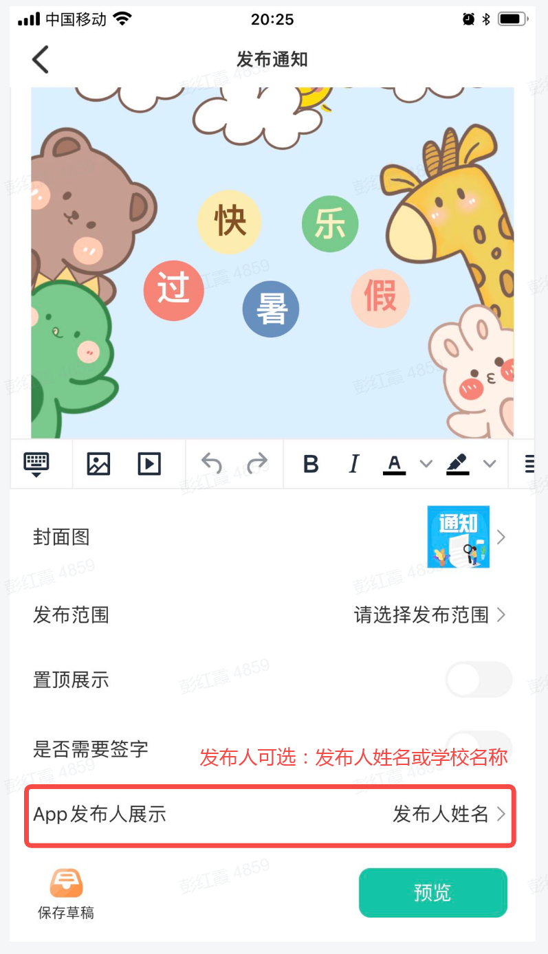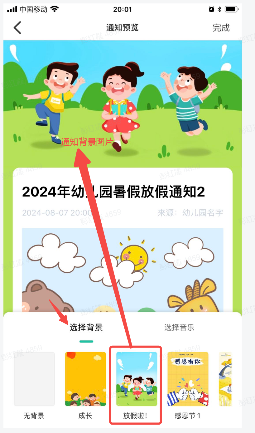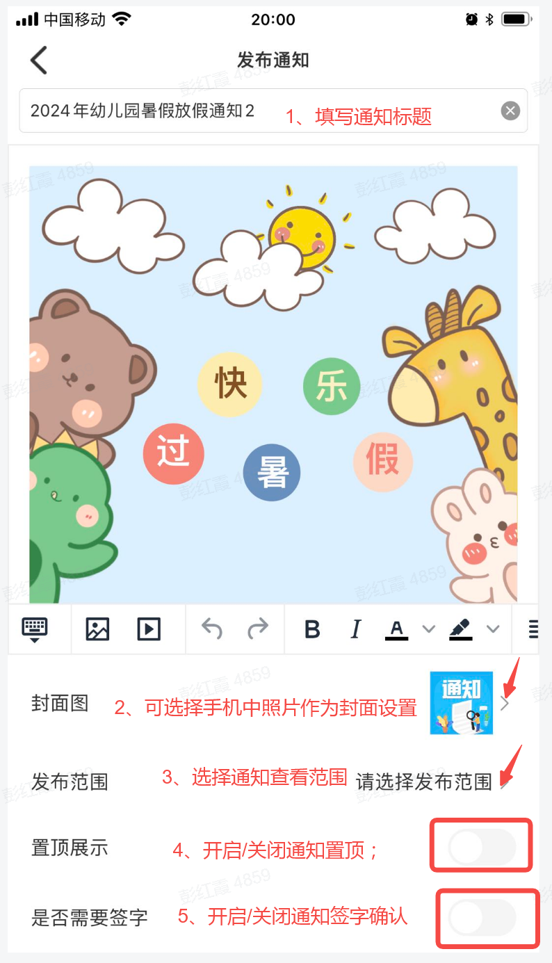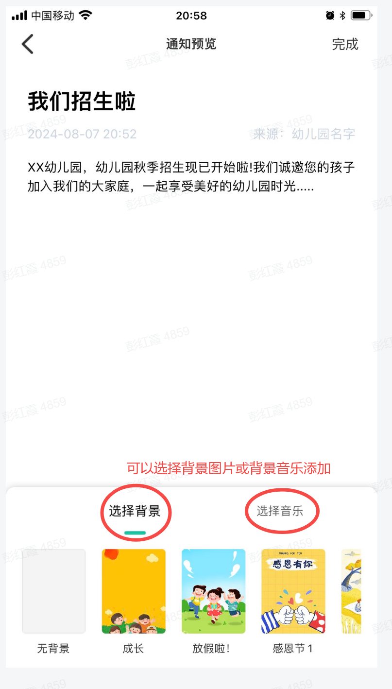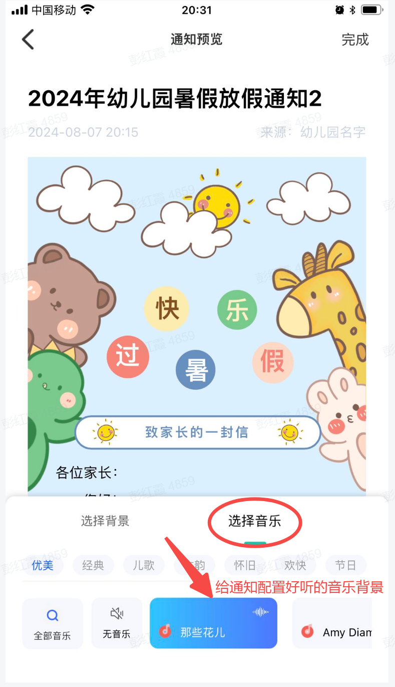 校园通知功能具有已读、未读的功能,统计时哪些家长已读哪些未读可 以一目了然; 通知如果需要家长签名的,也可以设置家长签名,而且我们的通知 功能有丰富的背景音乐模板,可以供园长、老师们选择,不需要 花大量的时间编辑,大大减轻了老师们的工作量。