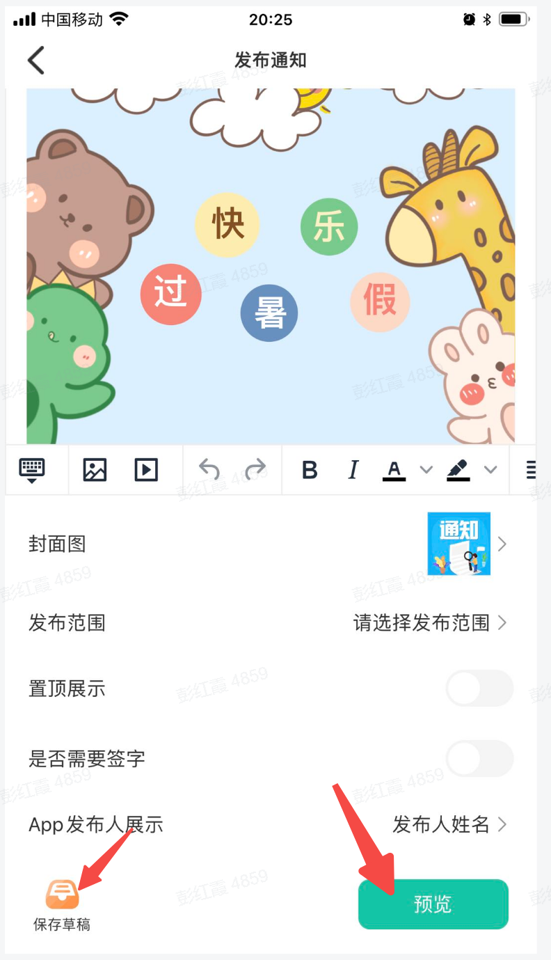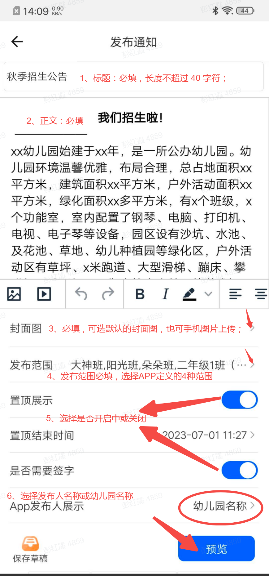 操作方法:登录园丁端 APP——工作台——“校园通知”——点击右上角的“发通知”——选择新建空白通知——填写通知内容——点击预览,右上角“完成”即可,具体如下图所示: