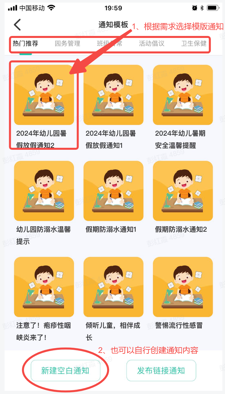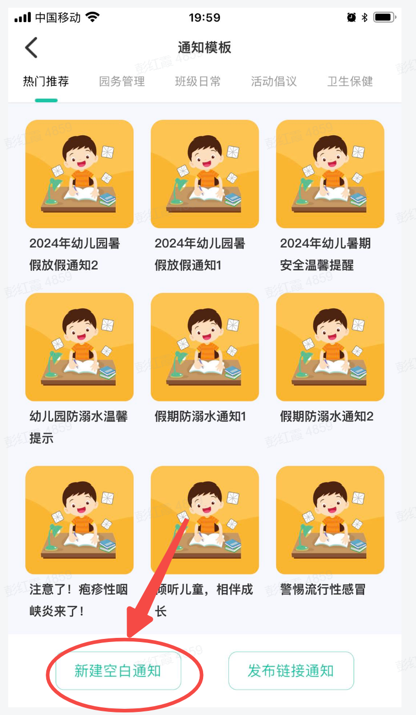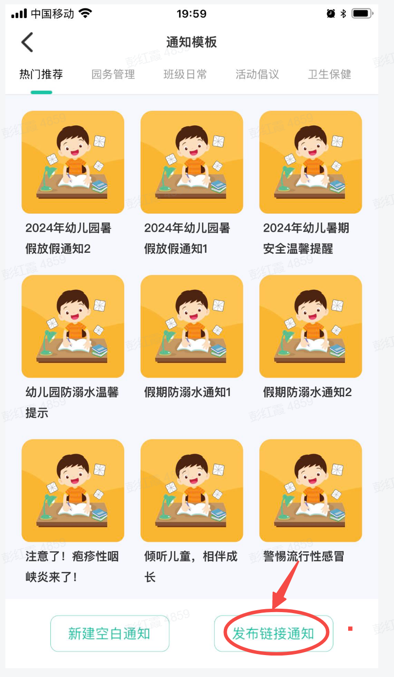 空白图文通知是学校直接编辑通知内容;链接通知是园所可以转发教育局官网或公众号的通知内容。