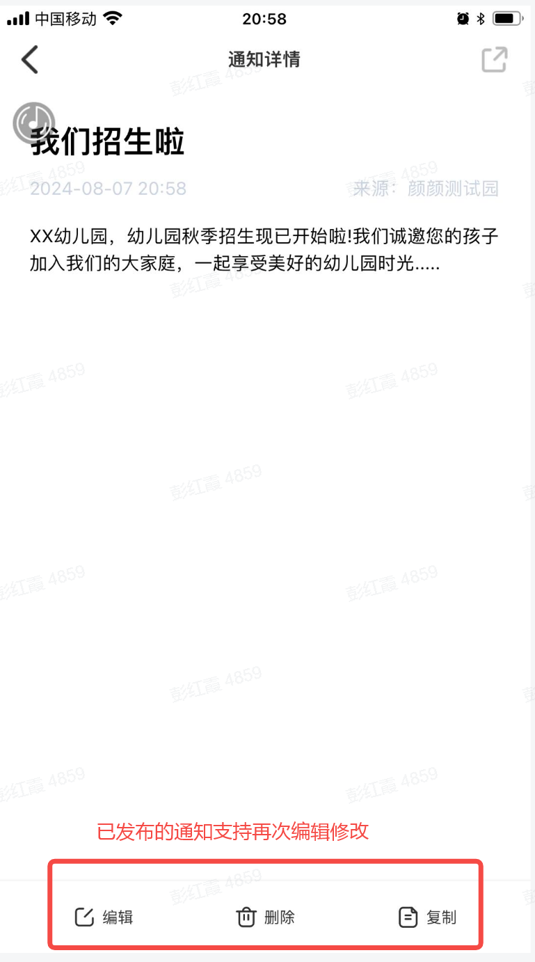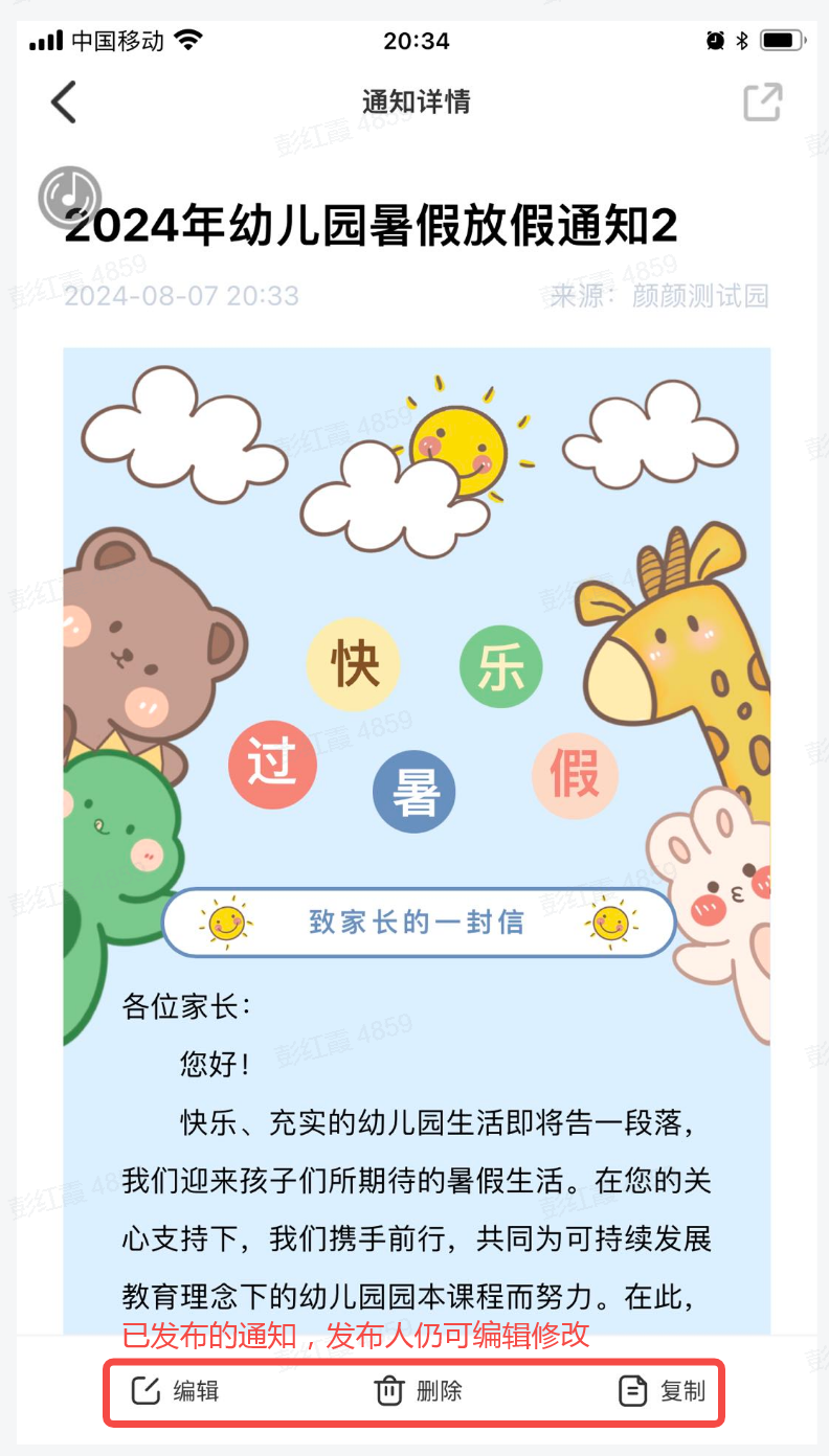 已发布的通知可支持再次编辑、删除及复制等操作,具体发下图所示:
