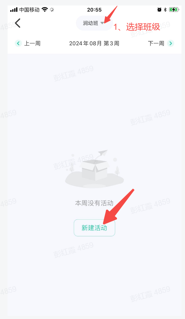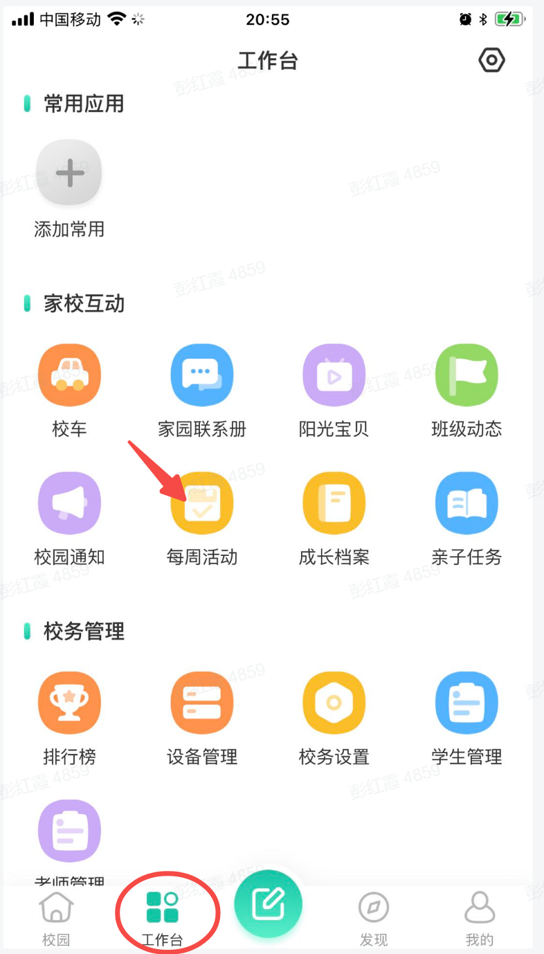 1、操作步骤:点击工作台——每周活动,选择需要创建活动的班级——点击新建活动