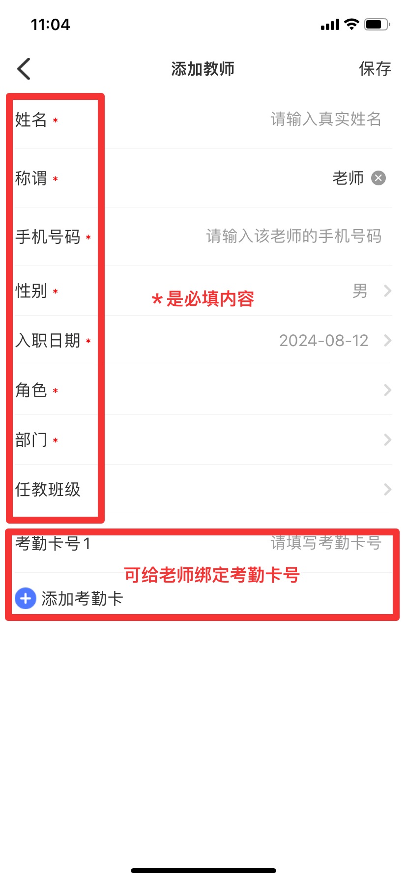 2、app 添加老师——在*位置填写老师的信息,即可帮助老师完成手动注册,还可以添加考勤卡号