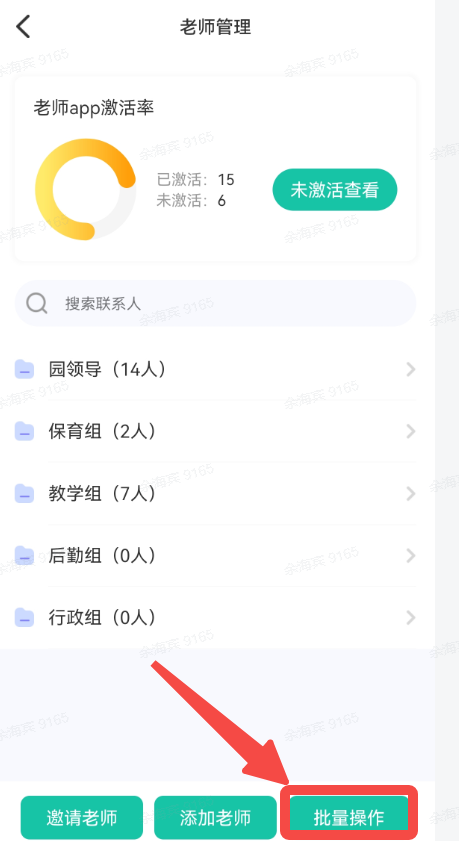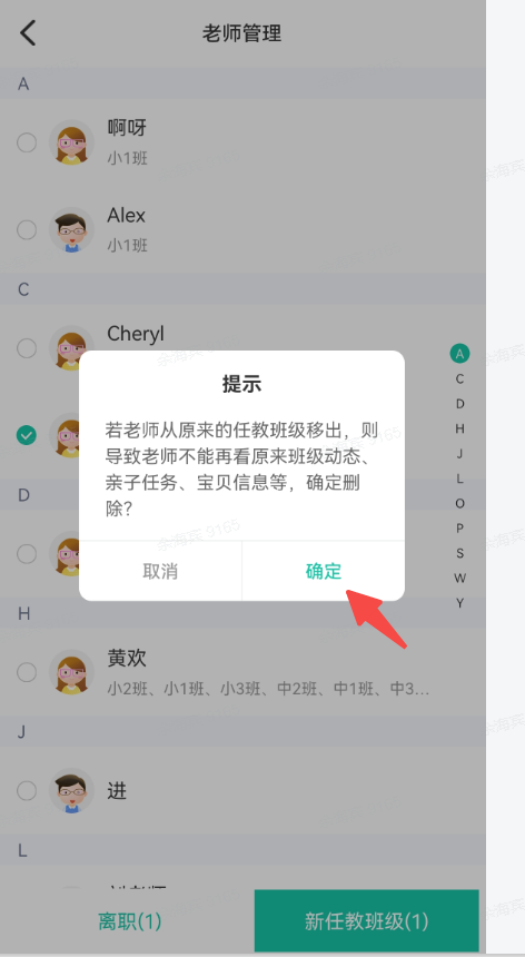 2、调班:点击“批量操作”—选择需要调班的老师—选择调整后的班级—点击确认即可完成调班