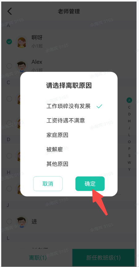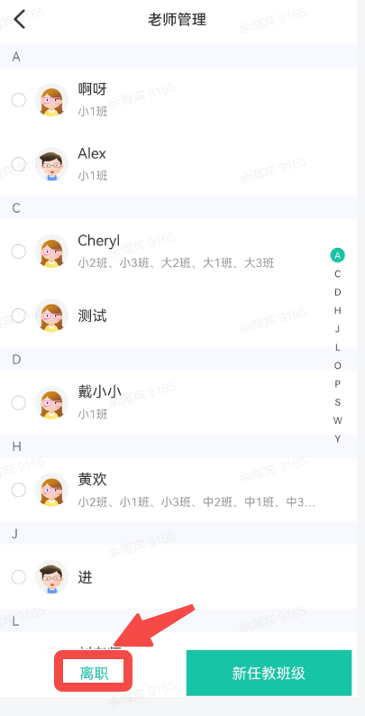 3、离职:点击“批量操作”—选择需要离园职的老师—选择离职原因,即可完成离园操作