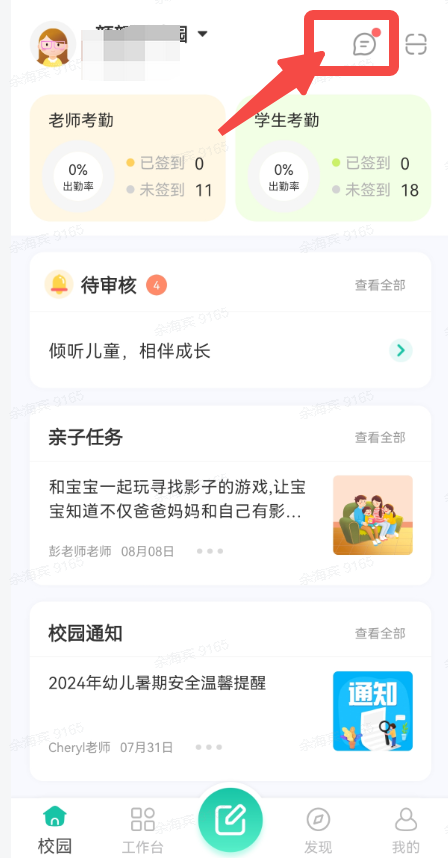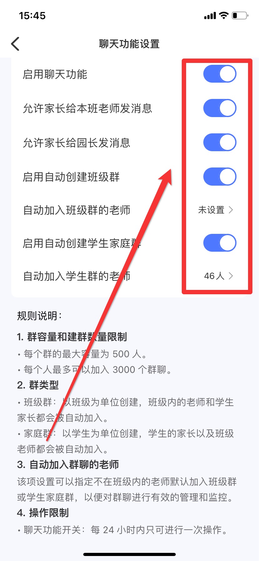 3、园长或管理员角色可点击聊天功能设置,可开启聊聊功能,并对聊聊功能进行设置