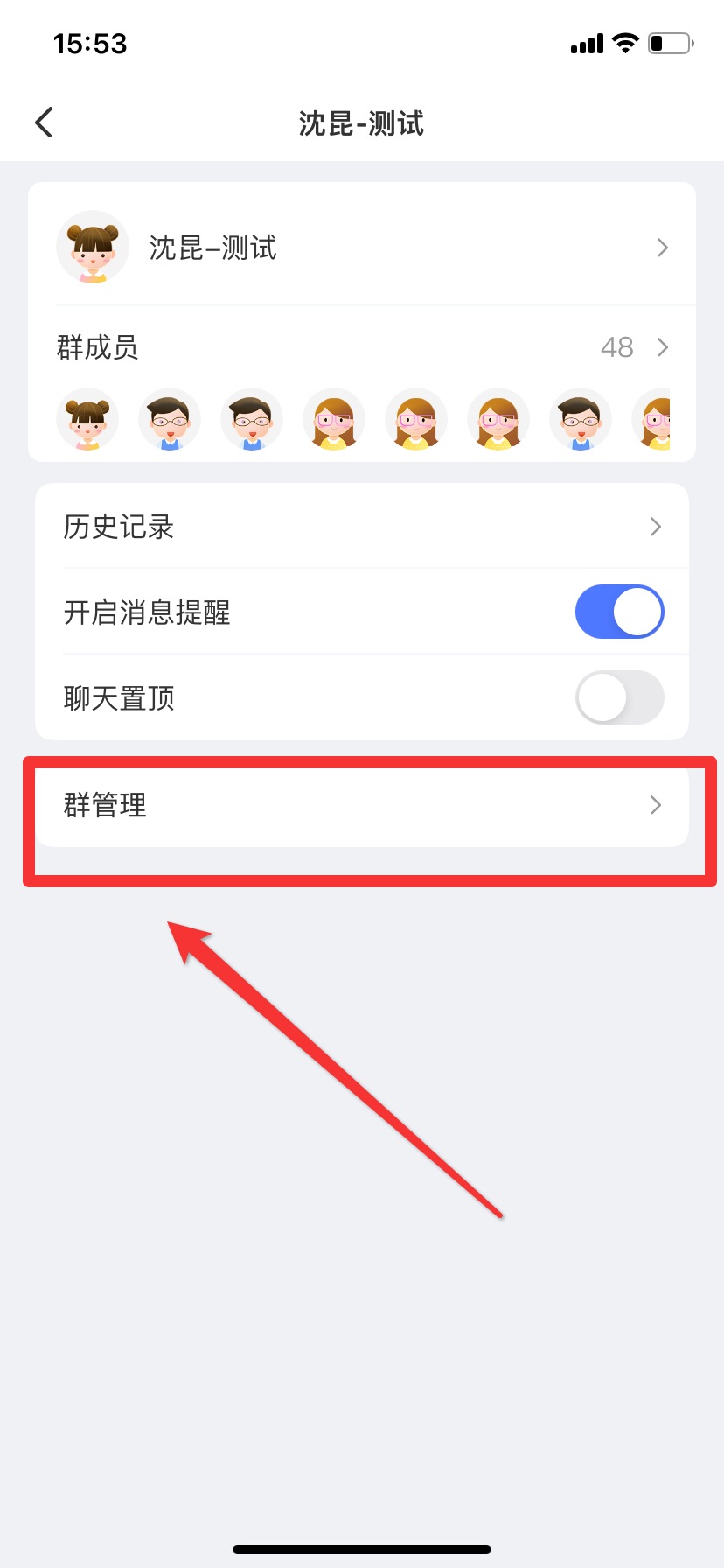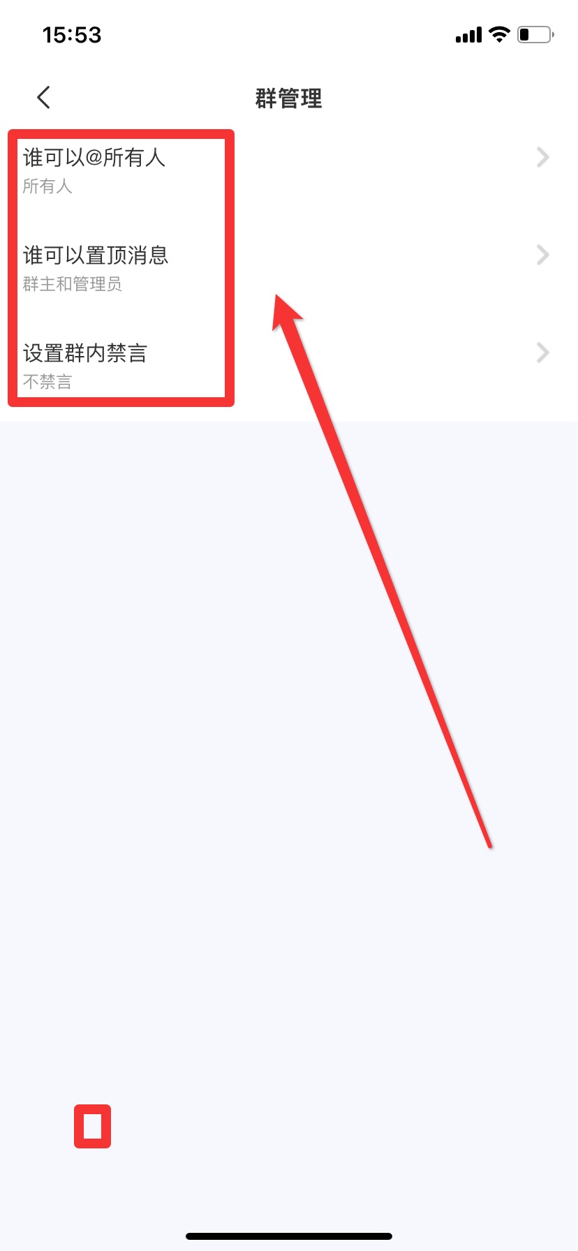 5、点击班级群里——右上角“…”可设置群管理,对老师或家长 @ 权限、置顶权限、群禁言权限等进行设置;
