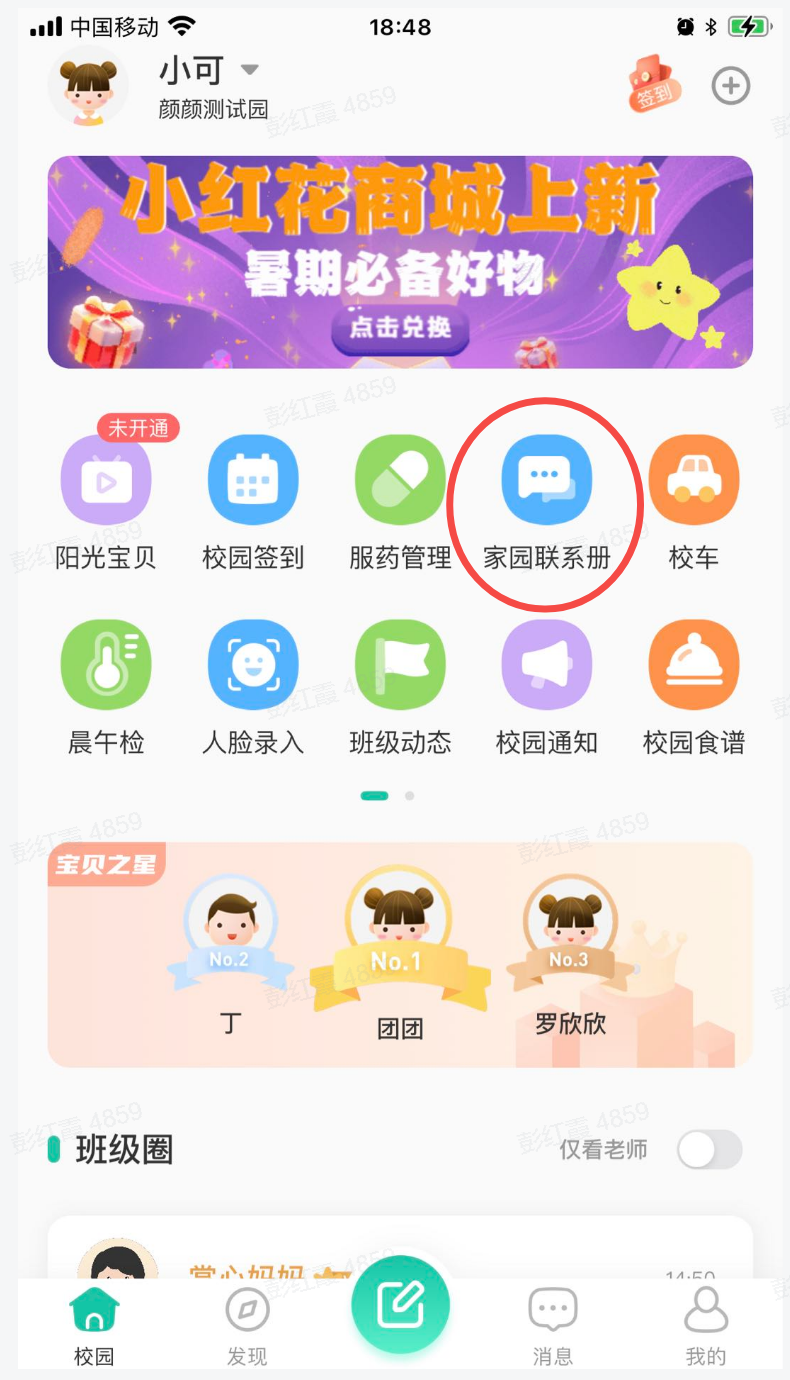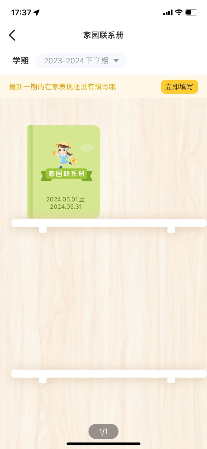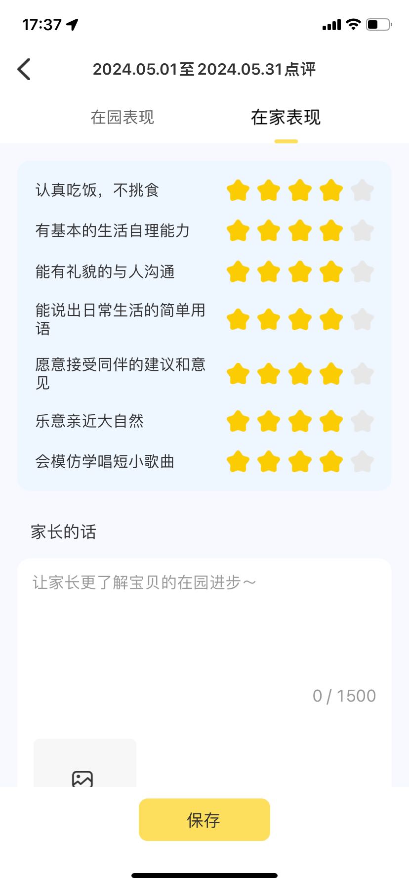 家长登录家长端 APP,首页点击“家园联系册”,选择对应的家园联系册进入,则会有“在家表现”的填写,家长填写完成后则生成孩子在这一阶段的发展评估结果。