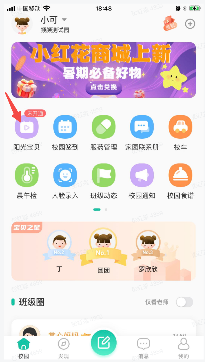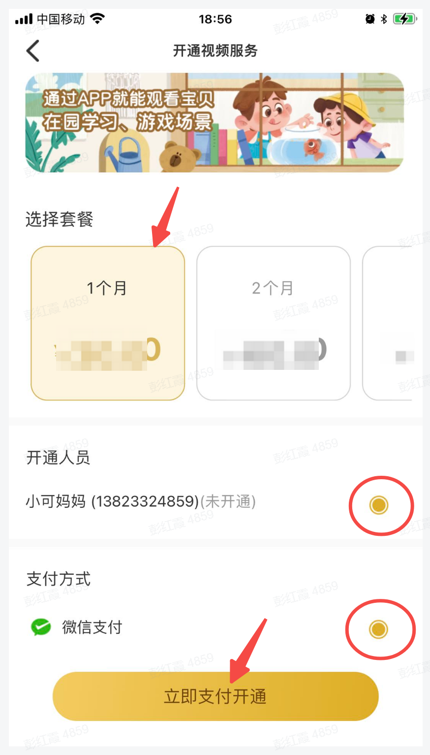 家长登录 APP,点击首页“阳光宝贝”——“立即开通看宝宝”,在开通页面选择需要开通的套餐(1 个月或 2 个月…)、开通人员及支付方式,完成开通支付,即可在“阳光宝贝”页面正常观看宝宝在幼儿园的视频了。同时,在观看有效期到期前 15 天,系统会有续费提醒。